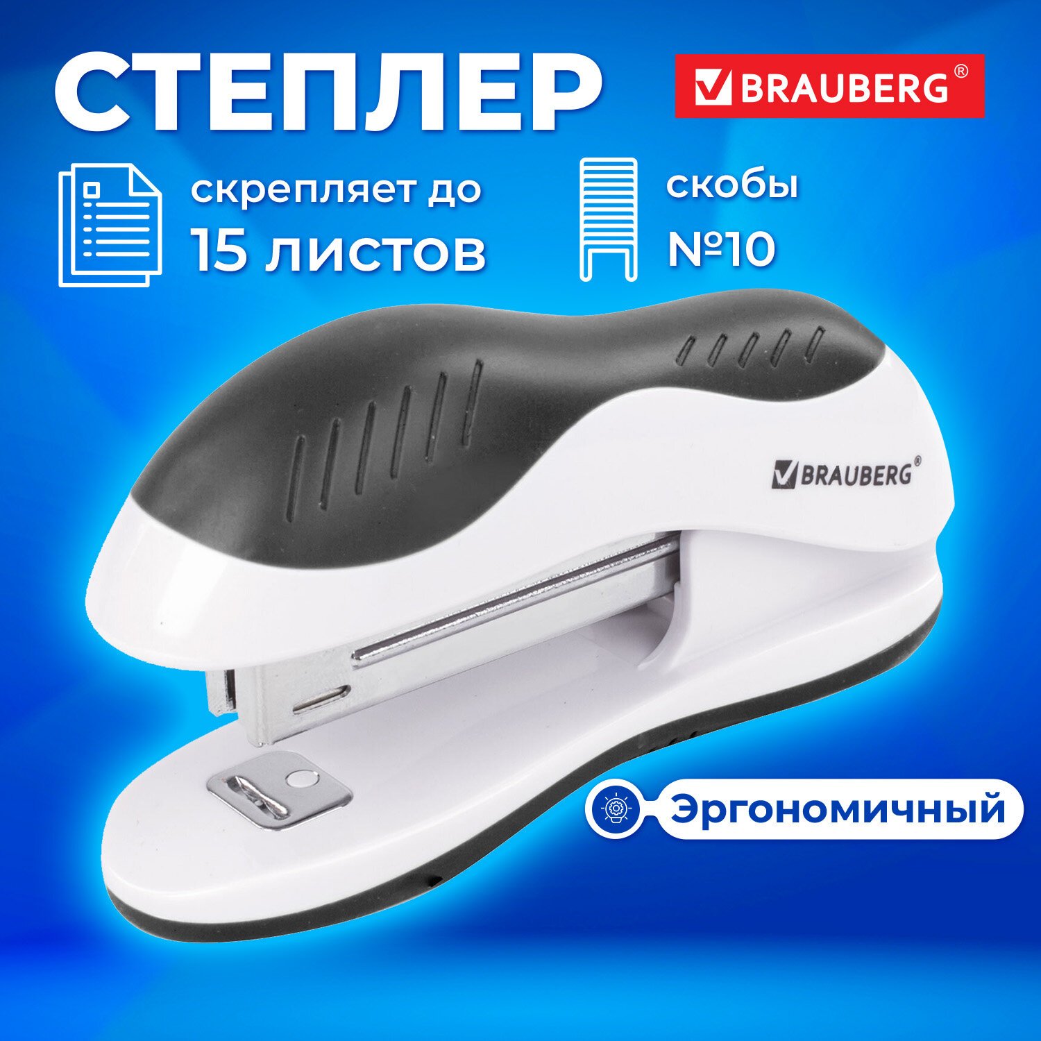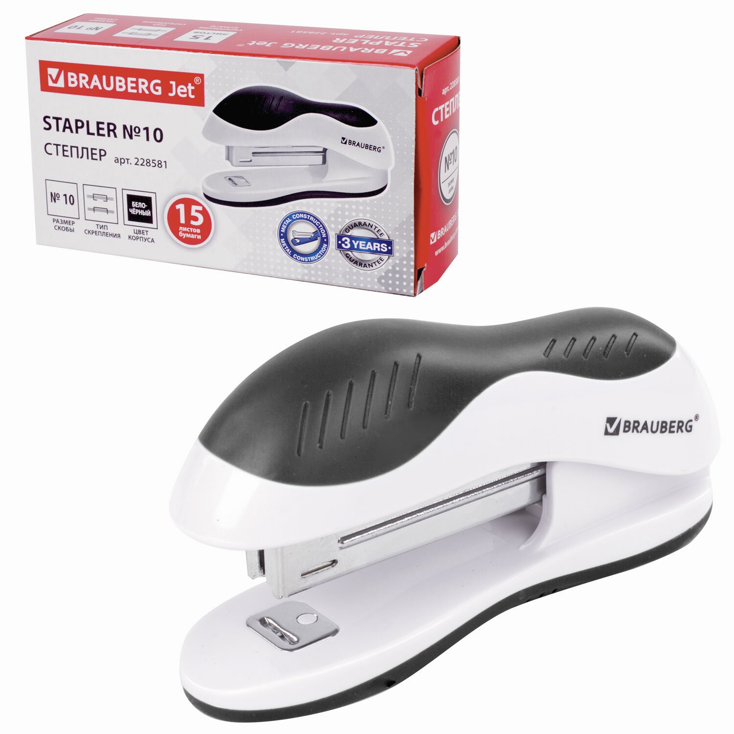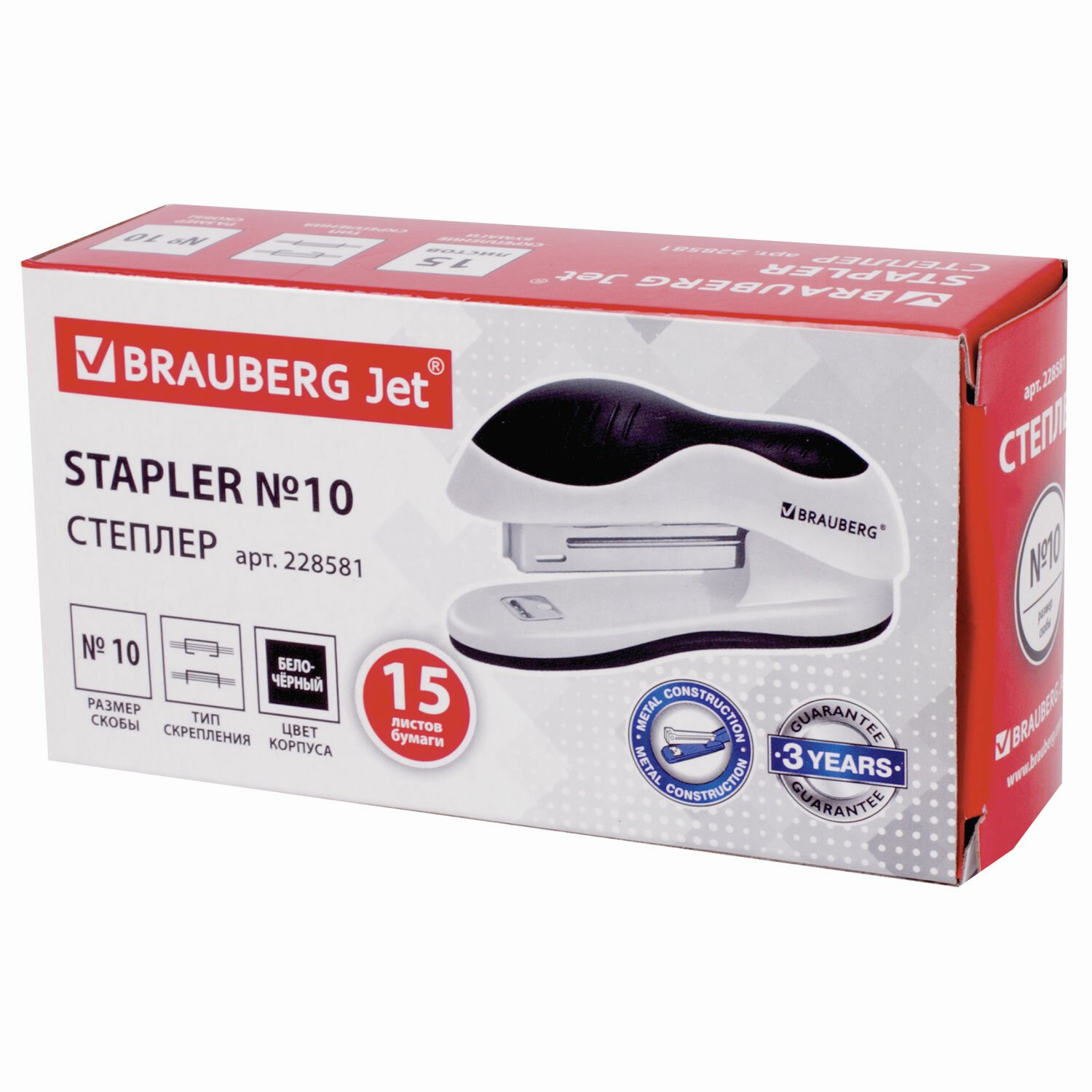 Степлер №10 BRAUBERG "JET", до 15 листов, эргономичный, бело-черный, 228581