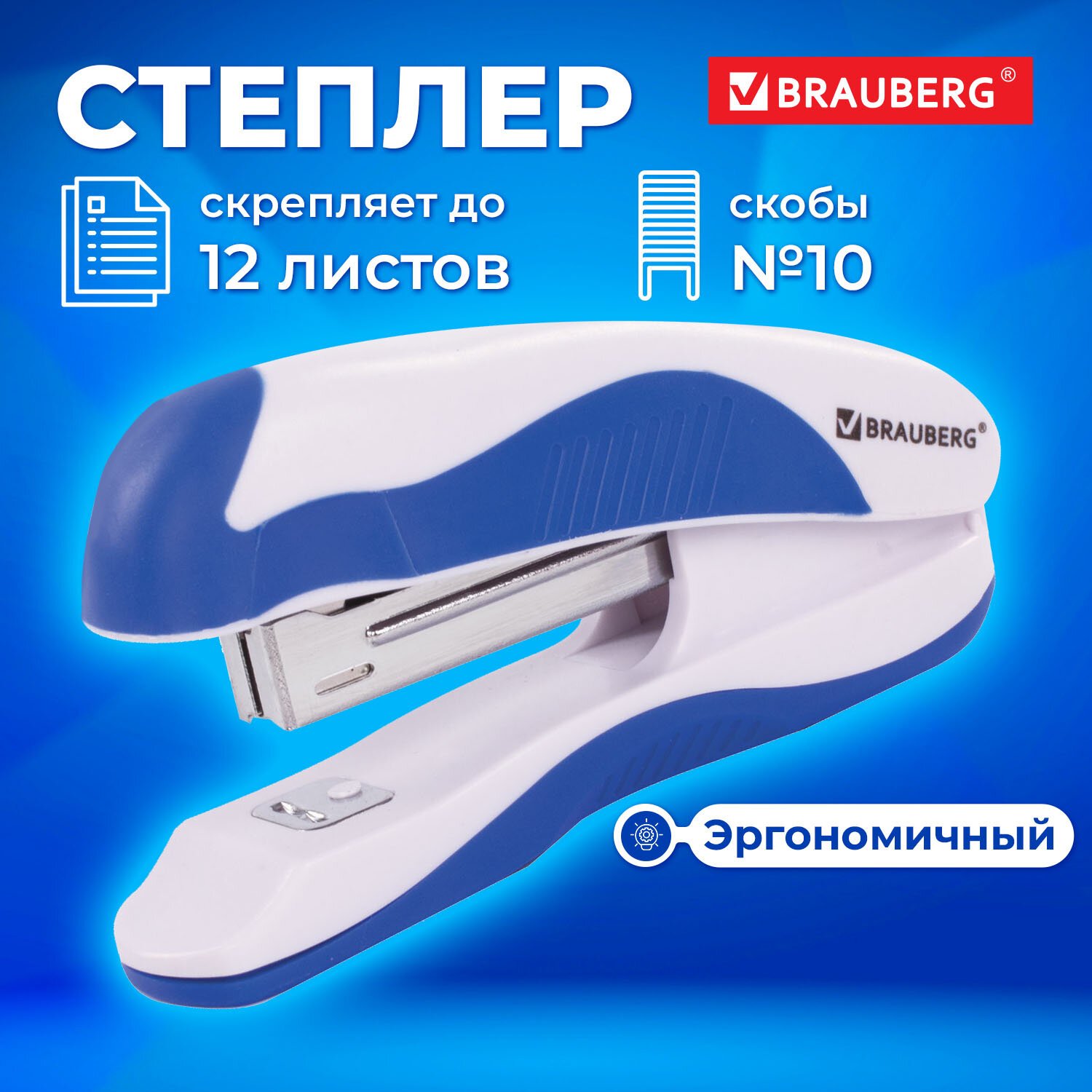 Степлер №10 BRAUBERG "JET PRO", до 12 листов, эргономичный, бело-синий, 228582