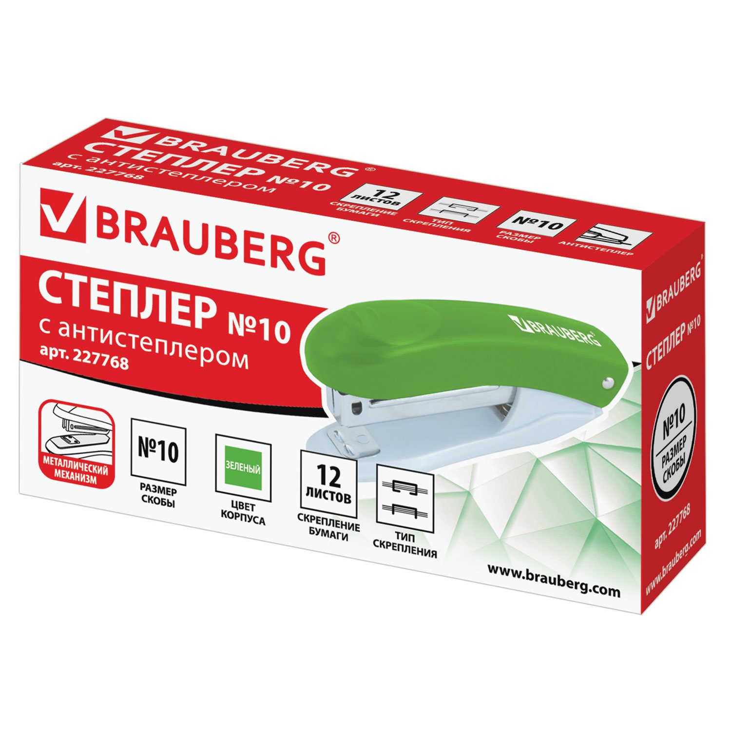 Степлер №10 BRAUBERG "Original", до 12 листов, с антистеплером, зеленый, 227768