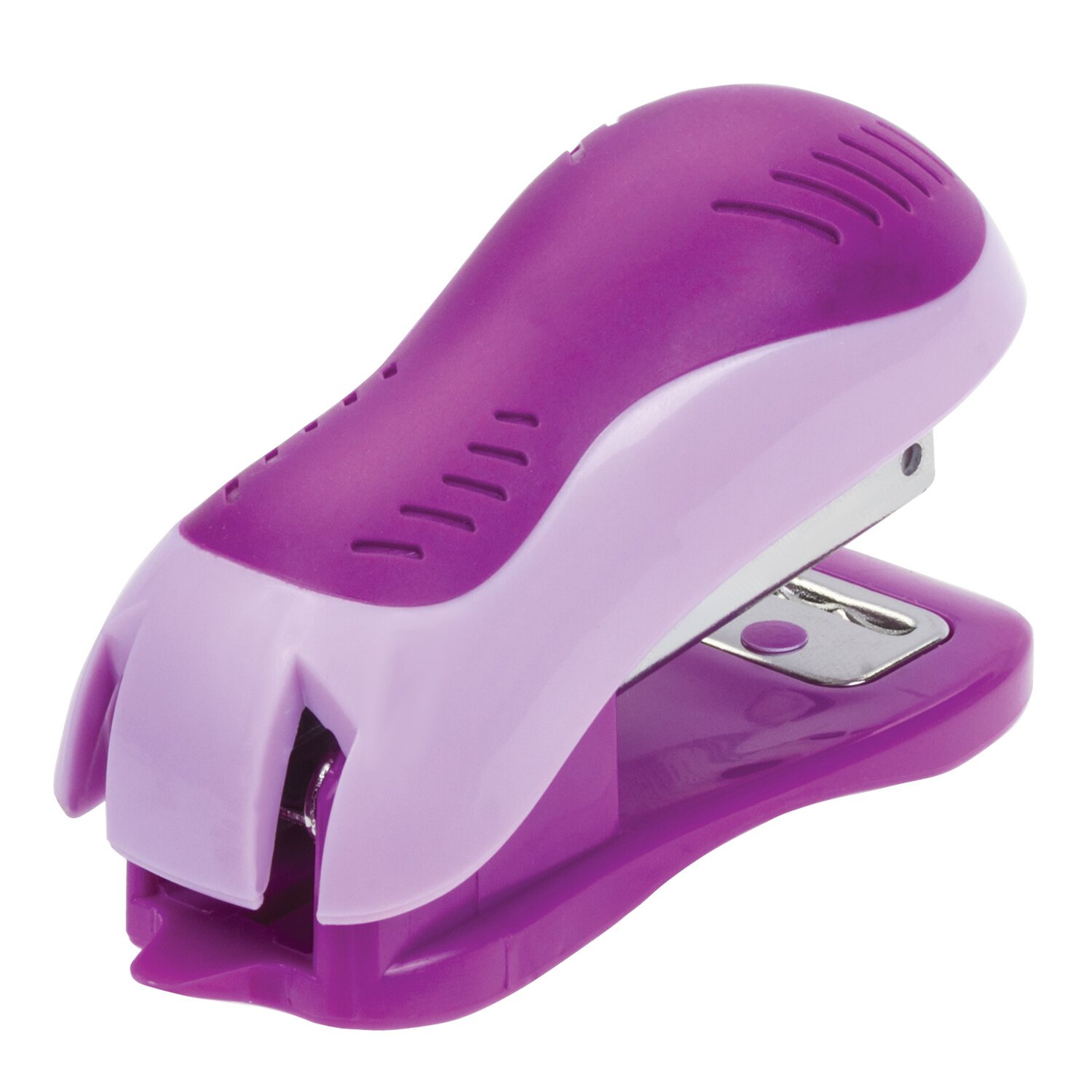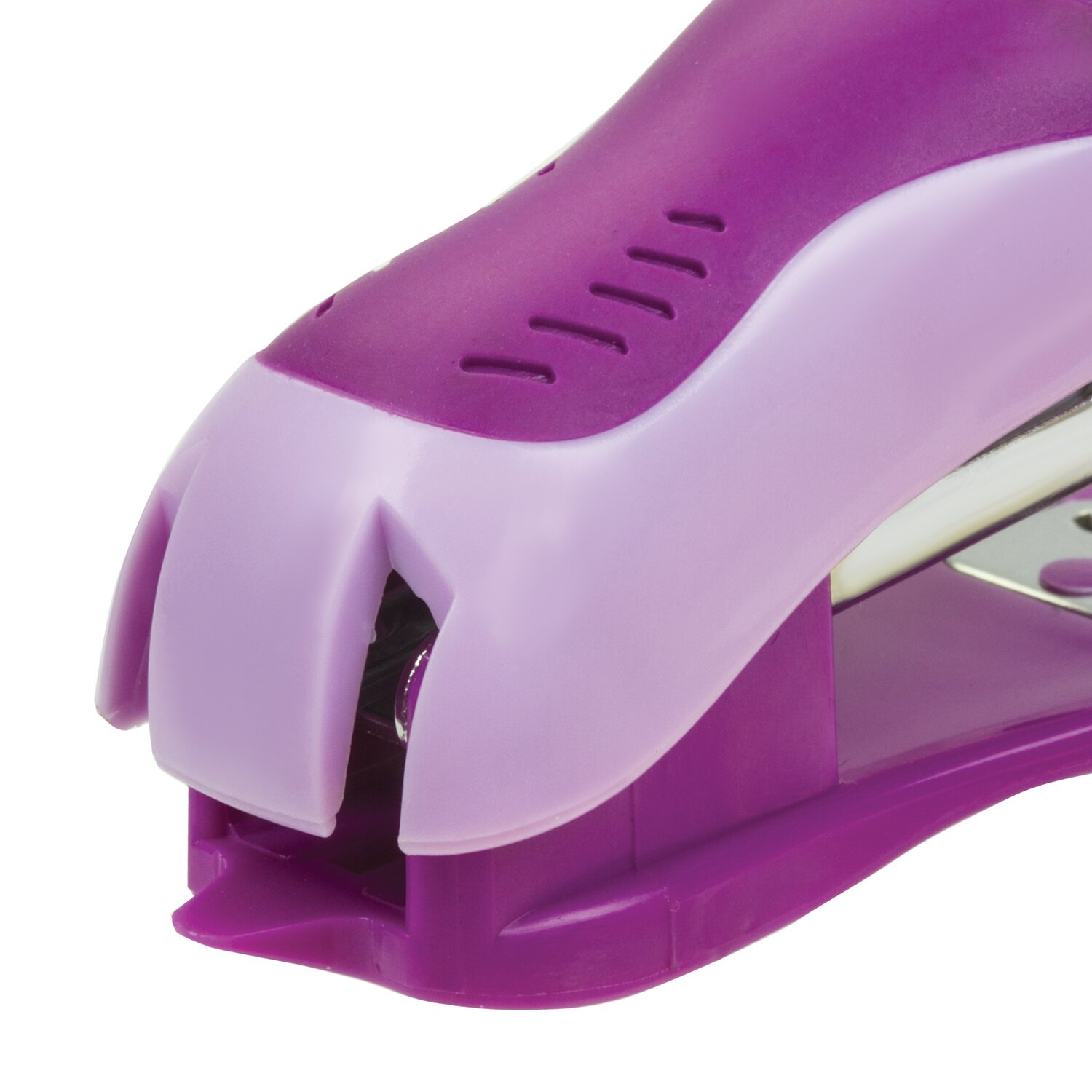 Для скрепления до 15 листов. Размер скоб №10. Глубина закладки бумаги - 25 мм. Закрытый вид сшивания. Эргономичная форма корпуса обеспечивает продолжительное время использования без перерыва. Данная модель может выступать в качестве антистеплера, позволяющего разжать закрепленные скобы более качественно, не нанося повреждений ни материалу, ни кончикам пальцев. За счет компактных размеров не займет на парте или столе много места, а сочетание фиолетового с сиреневым цветом добавят яркости во время уроков или написания домашней работы.