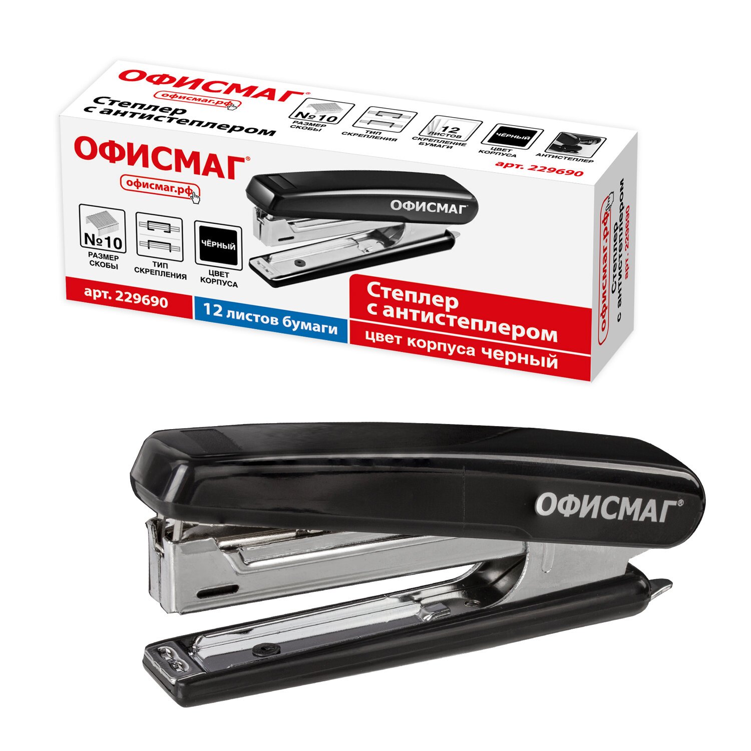Степлер №10 ОФИСМАГ, до 12 листов, с антистеплером, черный, 229690