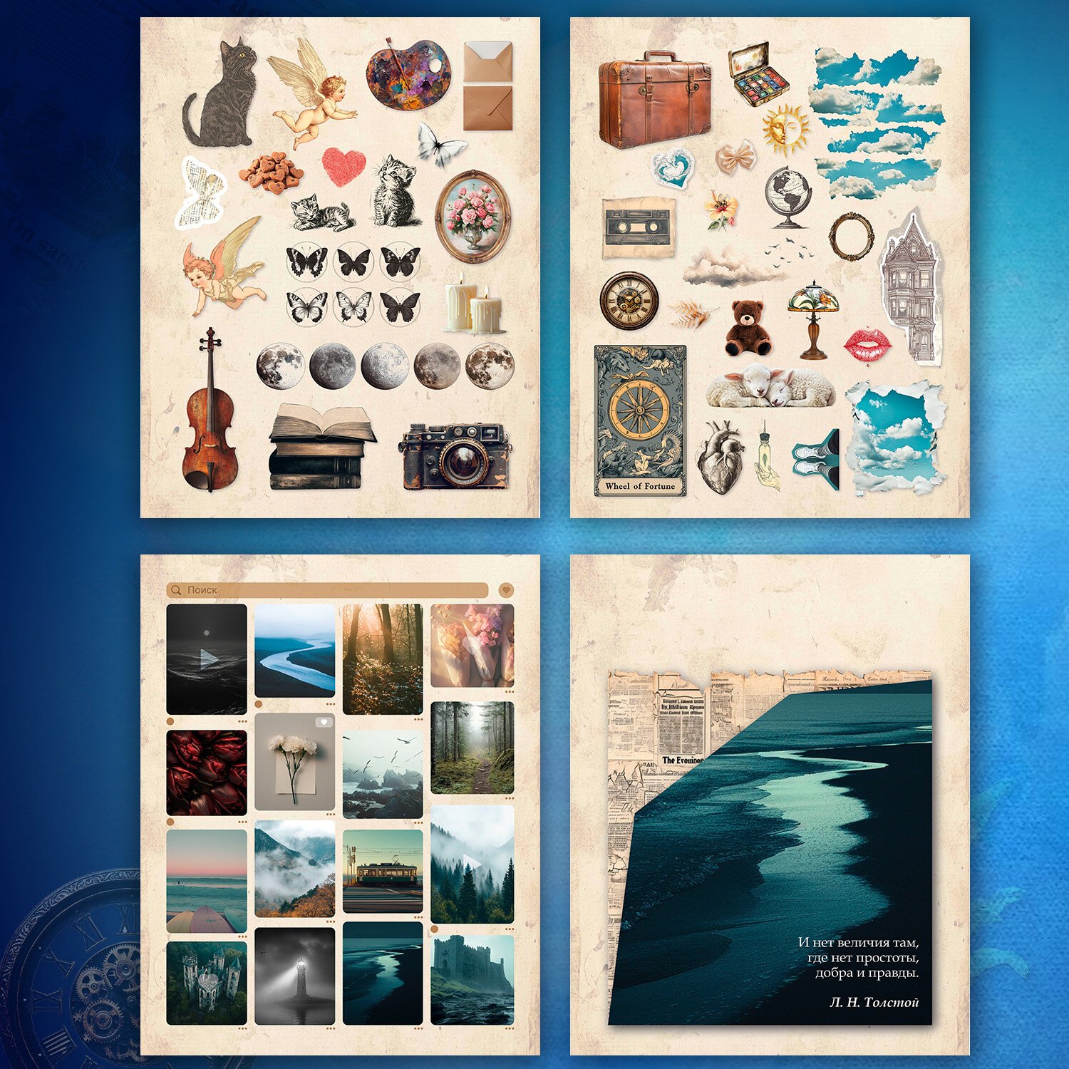Стикербук формата А5 по мимо стильных наклеек имеет иллюстрации на оборотной стороне, которые можно вырезать и наклеить при помощи клея после удаления всех наклеек. Это прекрасный способ дополнить наклейки дополнительными картинками. Наклейки не увеличат толщину страниц, так как очень тонкие и при этом плотные. Листочки скреплены при помощи скрепок.