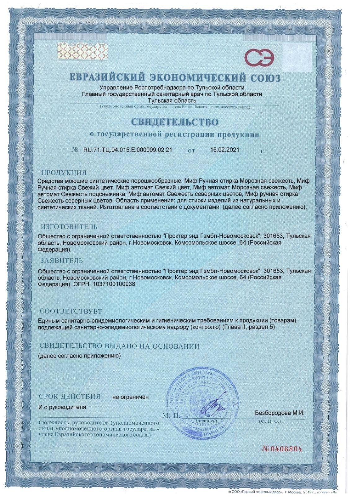 Благодаря уникальной технологии "Аквапудра" порошок растворяется едва коснувшись воды, и моментально активируется: удаляет даже трудновыводимые пятна и придает одежде сияющую чистоту. МИФ эффективно справляется с загрязнениями, а следов порошка не остается даже на темных тканях и в области швов. Только чистота и морозная свежесть!