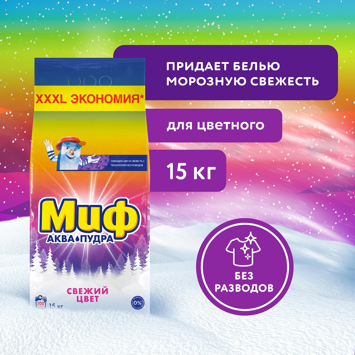 Стиральный порошок МИФ Аквапудра Свежий Цвет для цветного белья - это улучшенная формула МИФ для сияющей чистоты и яркости цвета с технологией против разводов. Порошок специально разработан для сохранения яркости цвета и придания свежести.