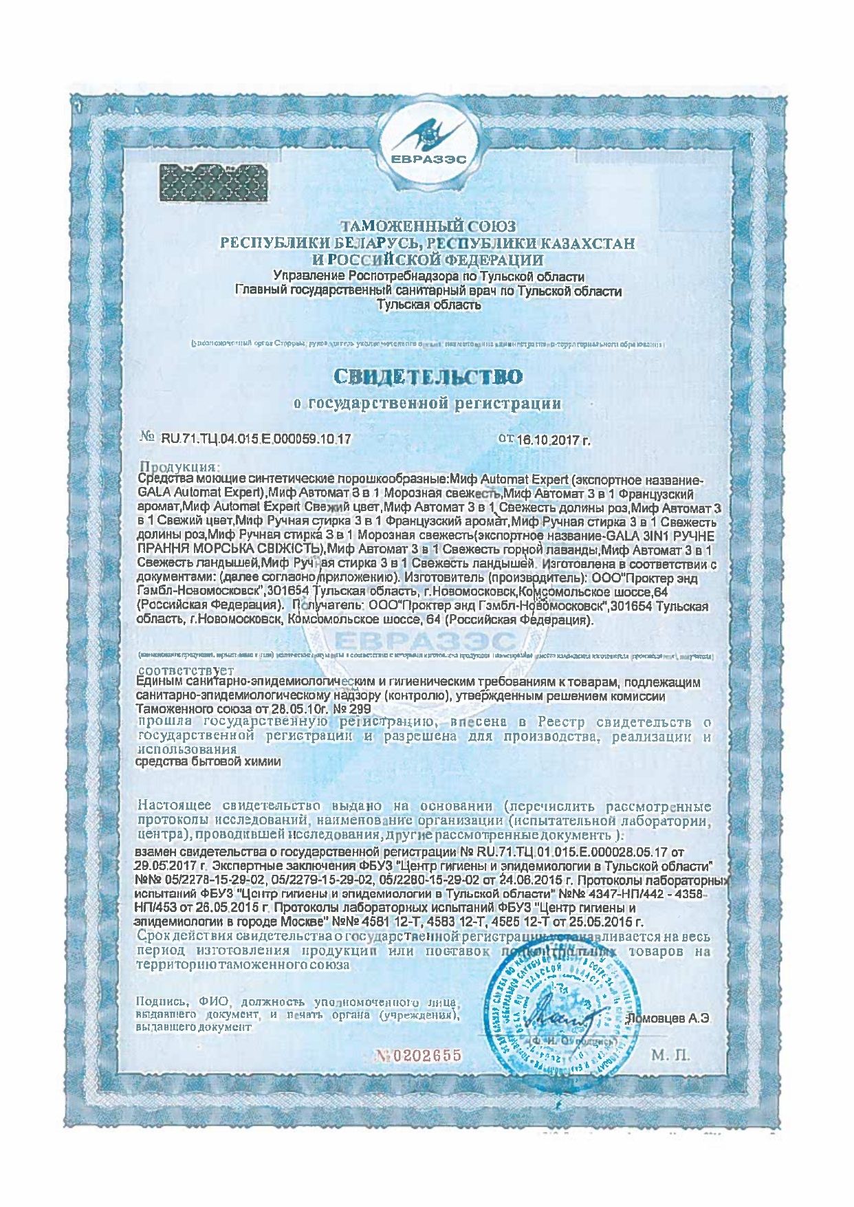 Состав: 5% или более, но менее 15%: анионные ПАВ, фосфаты; менее 5%: неионогенные ПАВ, кислородосодержащий отбеливатель, поликарбоксилаты; оптические отбеливатели, энзимы, ароматизирующие добавки; альфа-изометилионон, гексилциннамаль.
