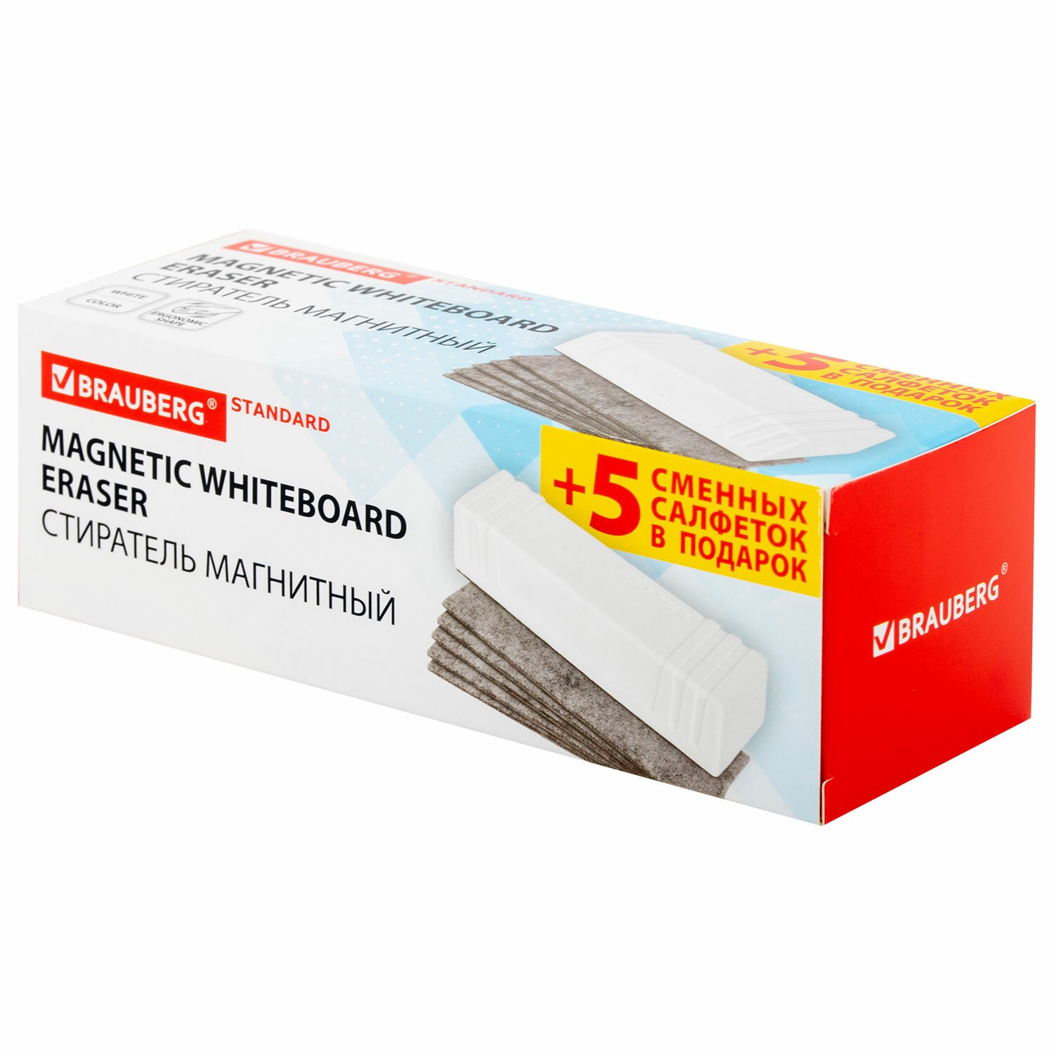 Магнитный стиратель BRAUBERG Standard со сменными салфетками предназначен для стирания сухим способом надписей, выполненных маркером, с белых досок.
