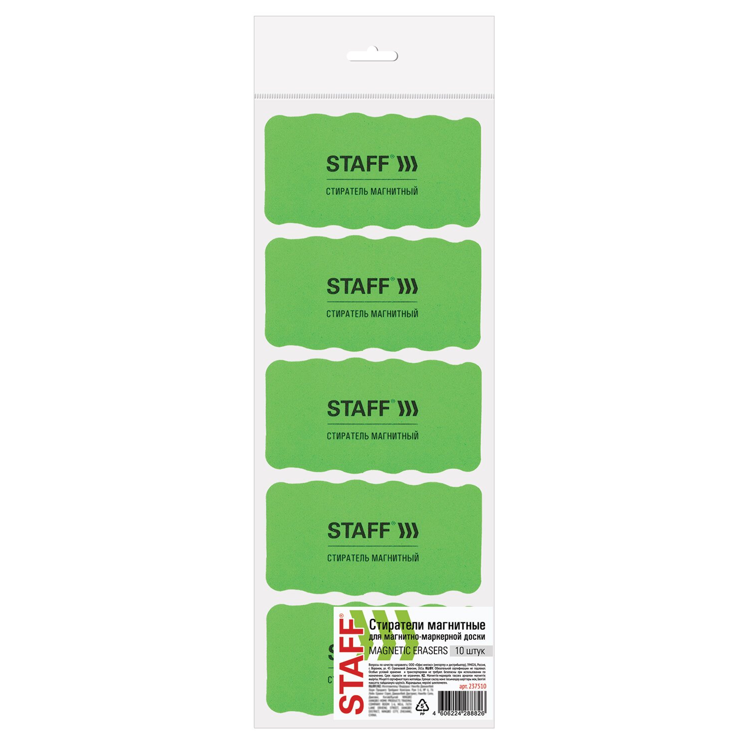 Стиратели магнитные для магнитно-маркерной доски, 57х107 мм, КОМПЛЕКТ 10 ШТ., STAFF "Basic", зеленые, 237510