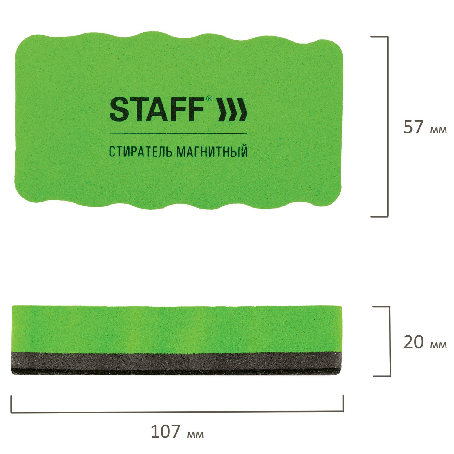 Встроенный магнит позволяет расположить стиратель в любом месте рабочей поверхности доски. Стиратель имеет эргономичную форму размером 107х57 мм. Стирающий слой выполнен из фетра. Поставляется в упаковке с европодвесом. В комплекте 10 стирателей зеленого цвета.