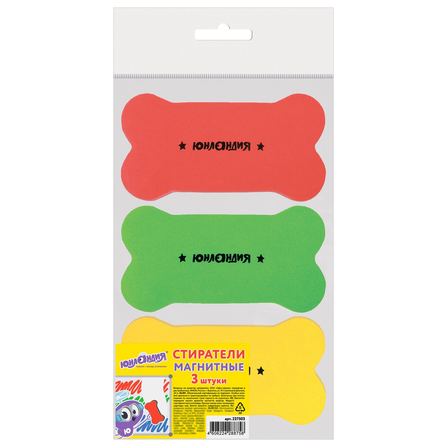 Стиратели магнитные для магнитно-маркерной доски ЮНЛАНДИЯ "Косточка", 55х110 мм, КОМПЛЕКТ 3 ШТ., ассорти, 237503