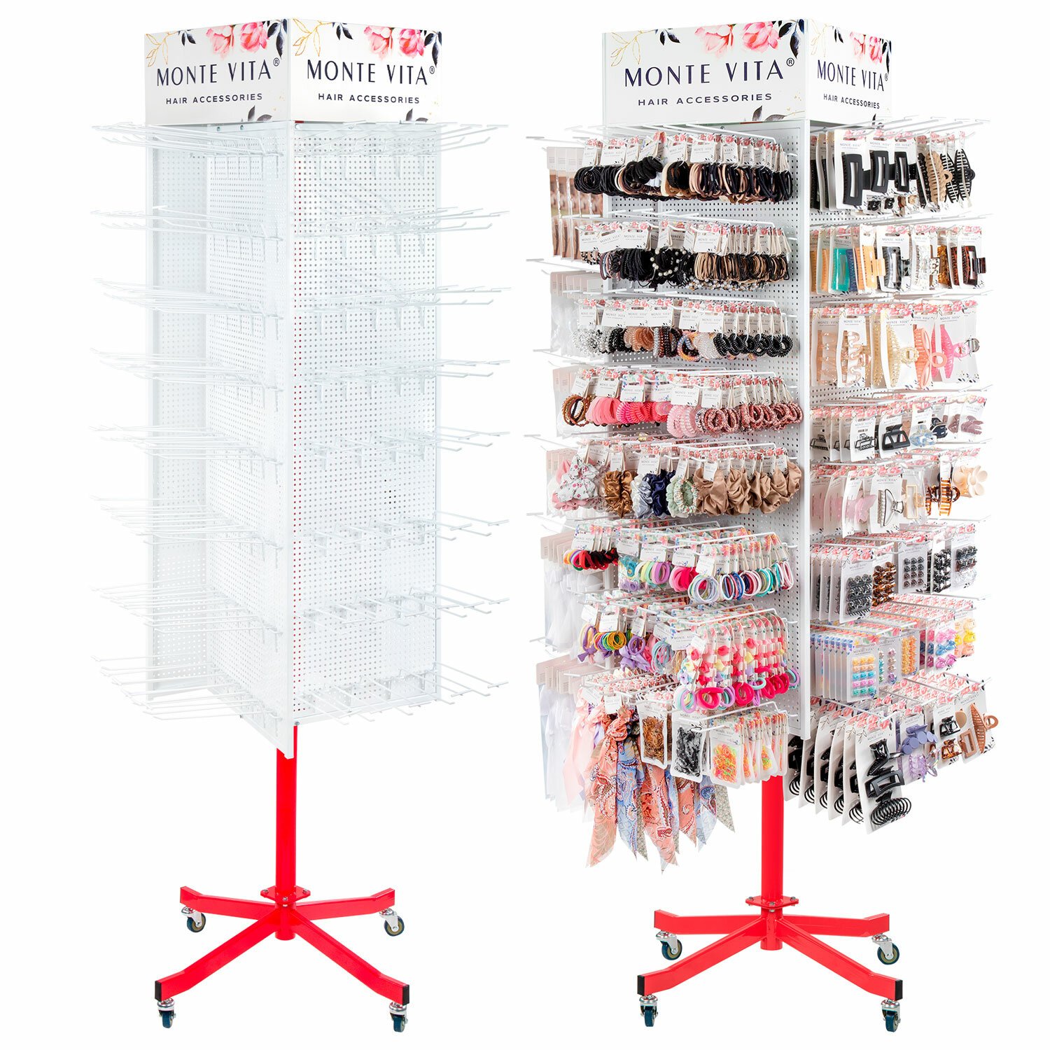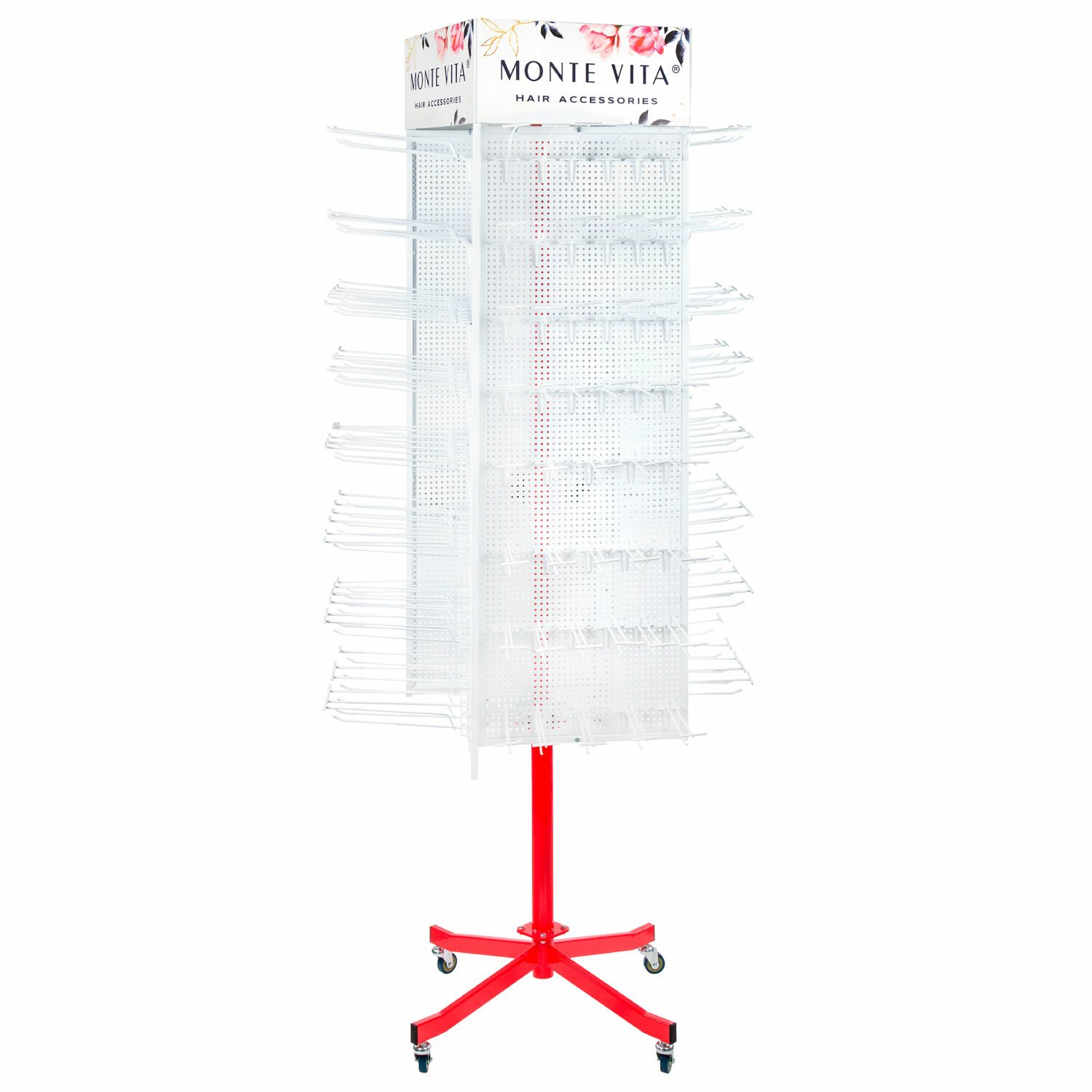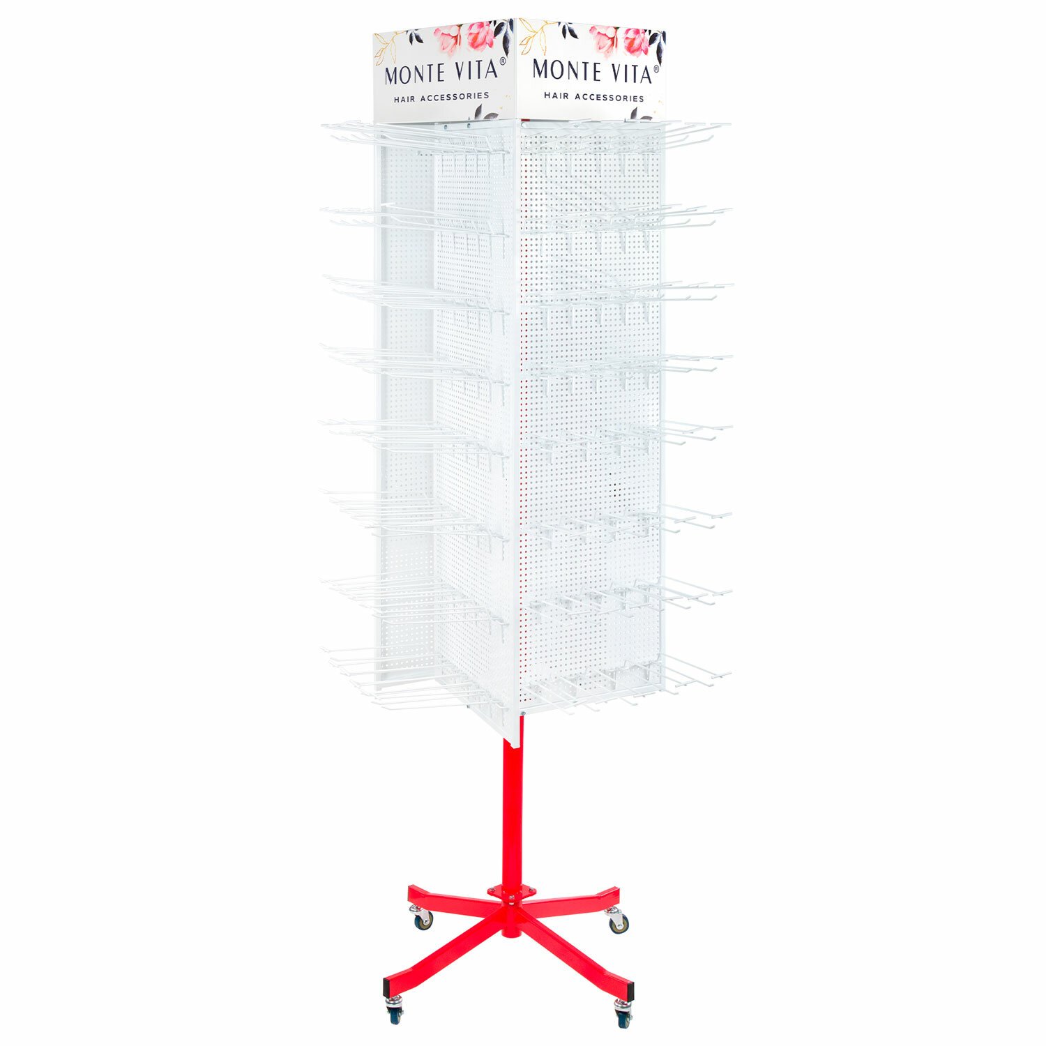 Стойка обеспечивает быстрый доступ к каждому крючку, а перфорированная панель позволит перемещать крючки под необходимые габариты товара. Надежная металлическая конструкция стойки позволяет разместить максимальное количество аксессуаров для волос даже в небольших торговых пространствах.