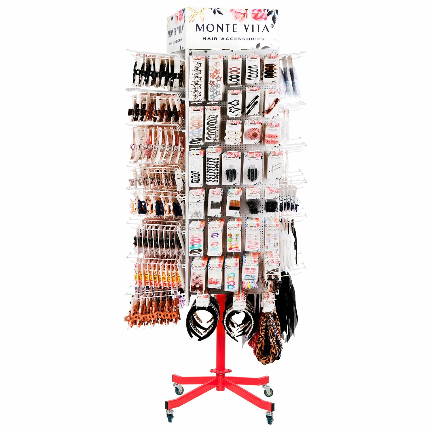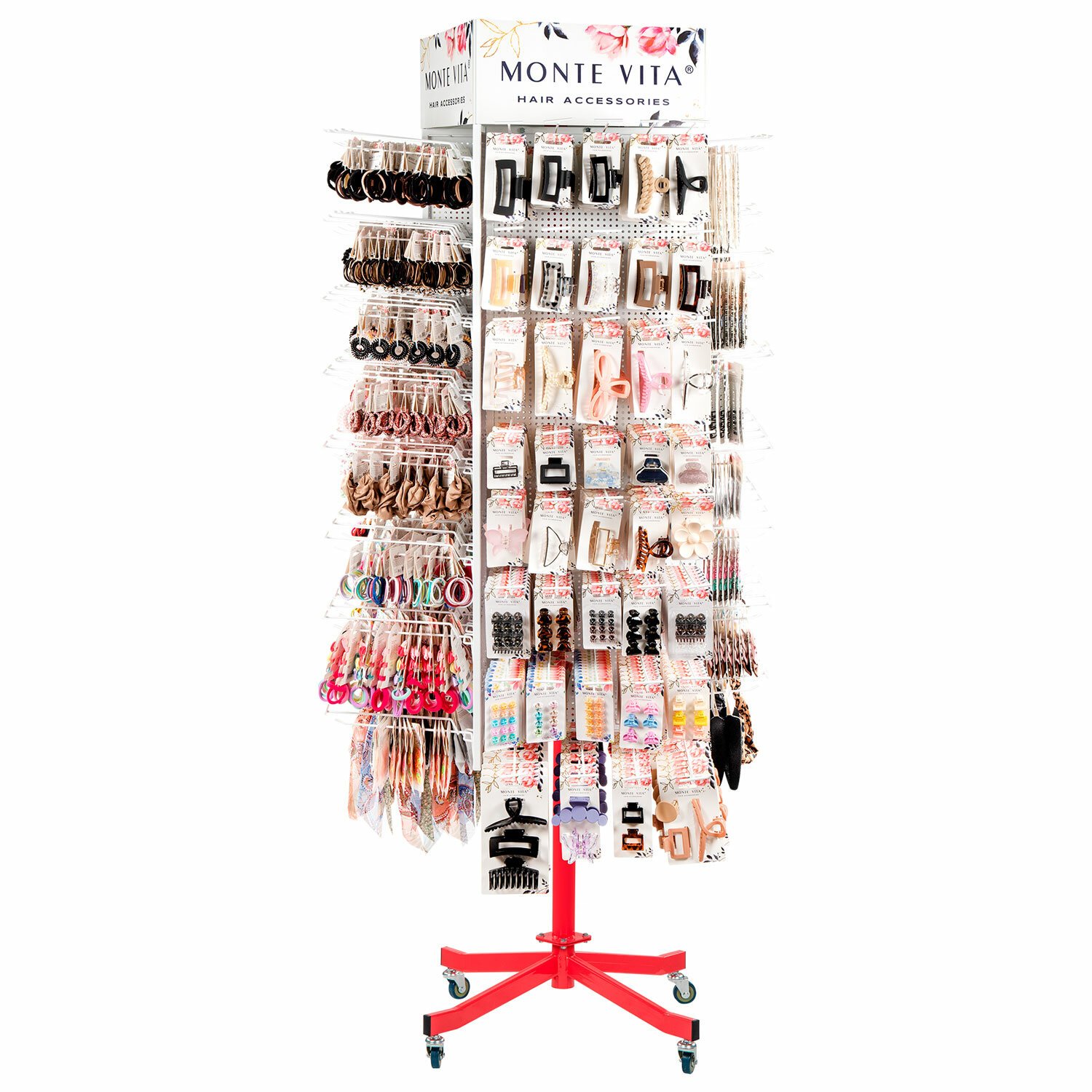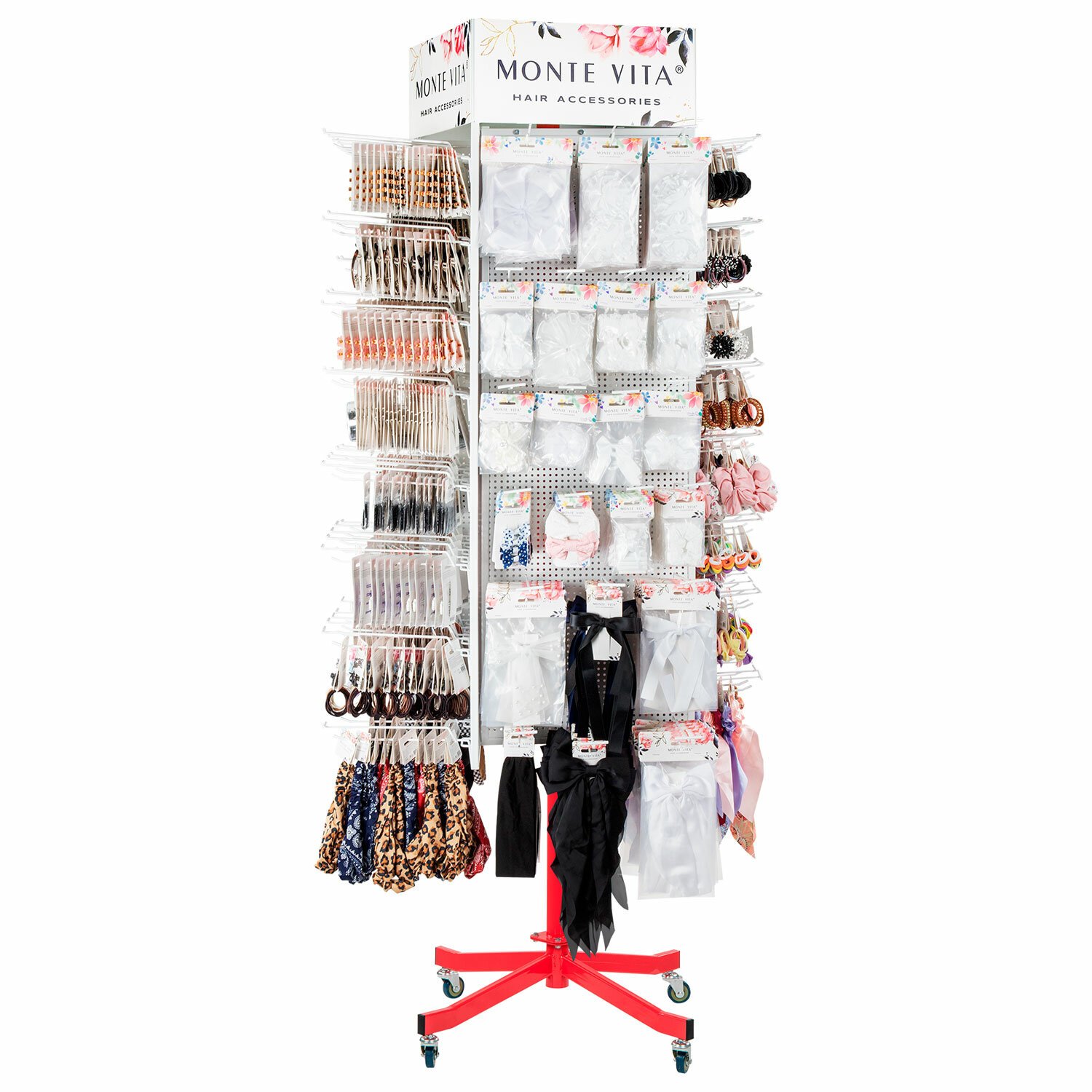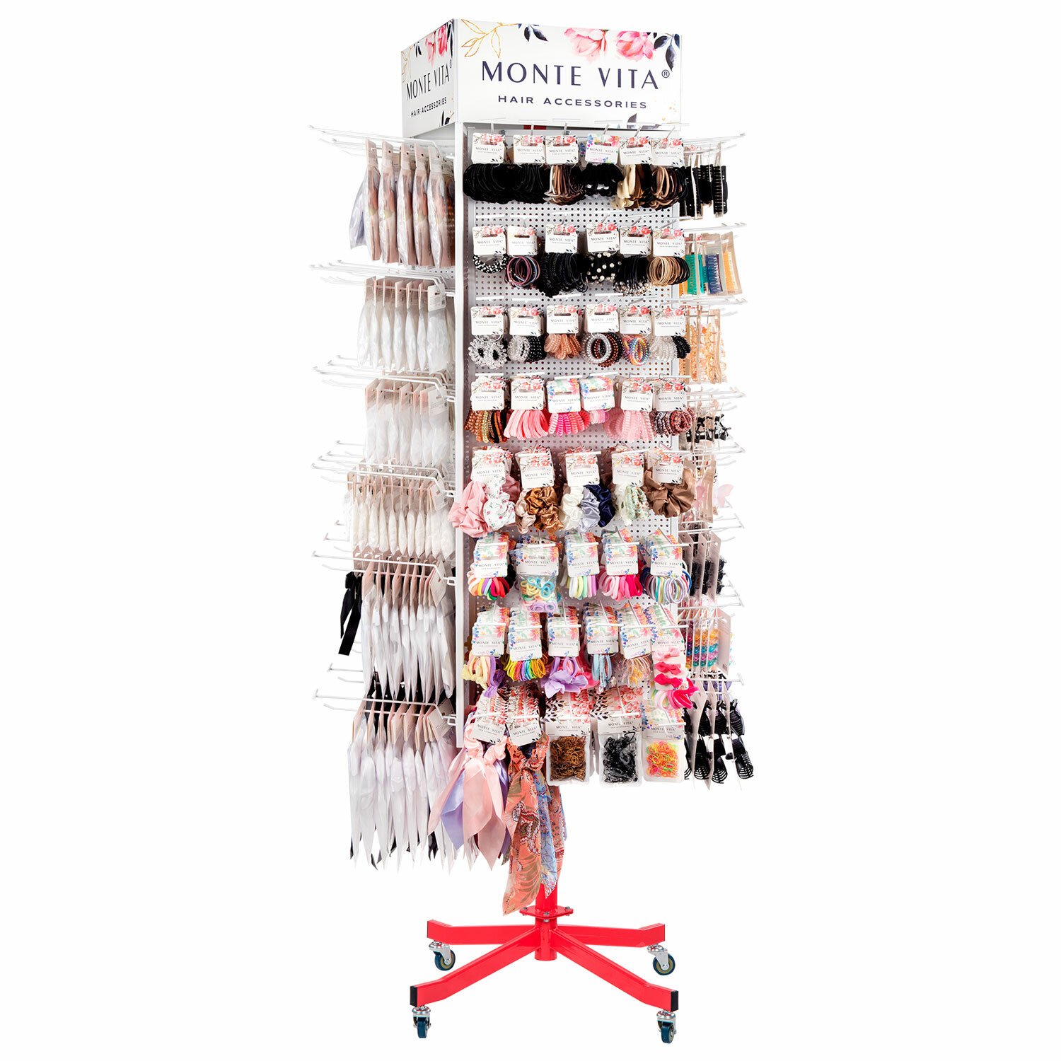 Стойка обеспечивает быстрый доступ к каждому крючку, а перфорированная панель позволит перемещать крючки под необходимые габариты товара. Надежная металлическая конструкция стойки позволяет разместить максимальное количество аксессуаров для волос даже в небольших торговых пространствах.