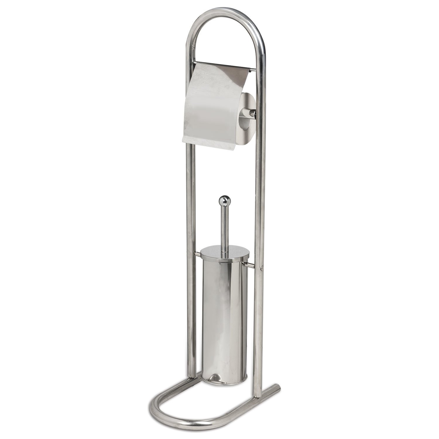 Изготовлен из нержавеющей стали. Обладает зеркальной поверхностью. Представляет собой эргономичнуюю напольную стойку со встроенным держателем для туалетной бумаги и подставкой для ерша с ершом в комплекте. Размер - 165х800х300 мм.