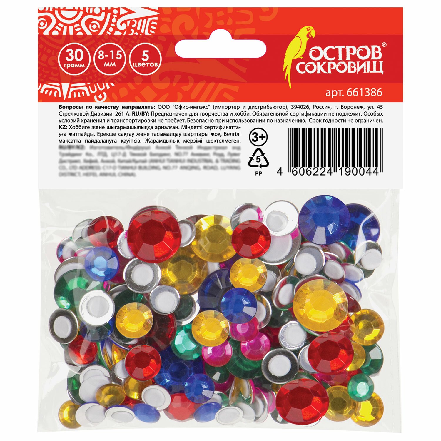 Стразы самоклеящиеся "Круглые", размер 8-15 мм, 30 г, 5 цветов, ОСТРОВ СОКРОВИЩ, 661386
