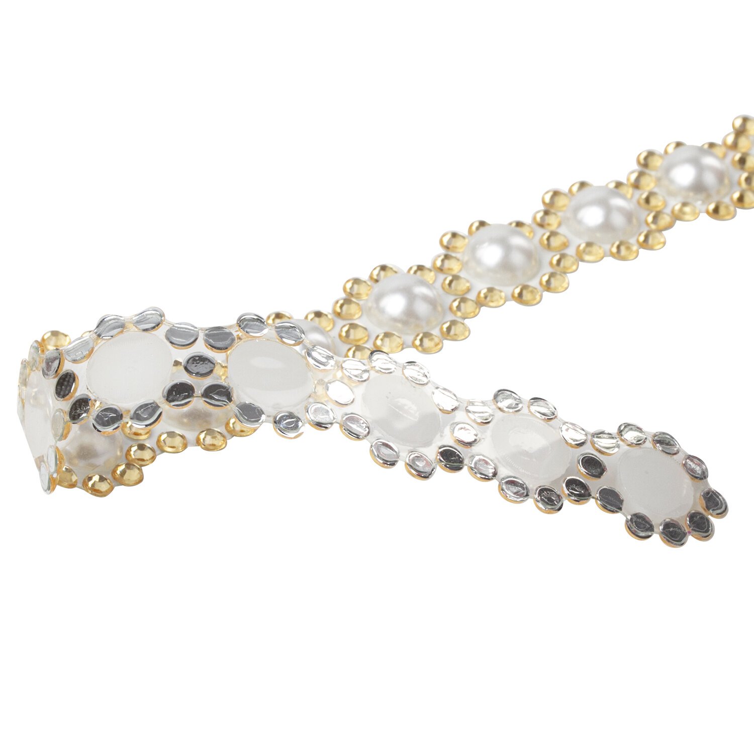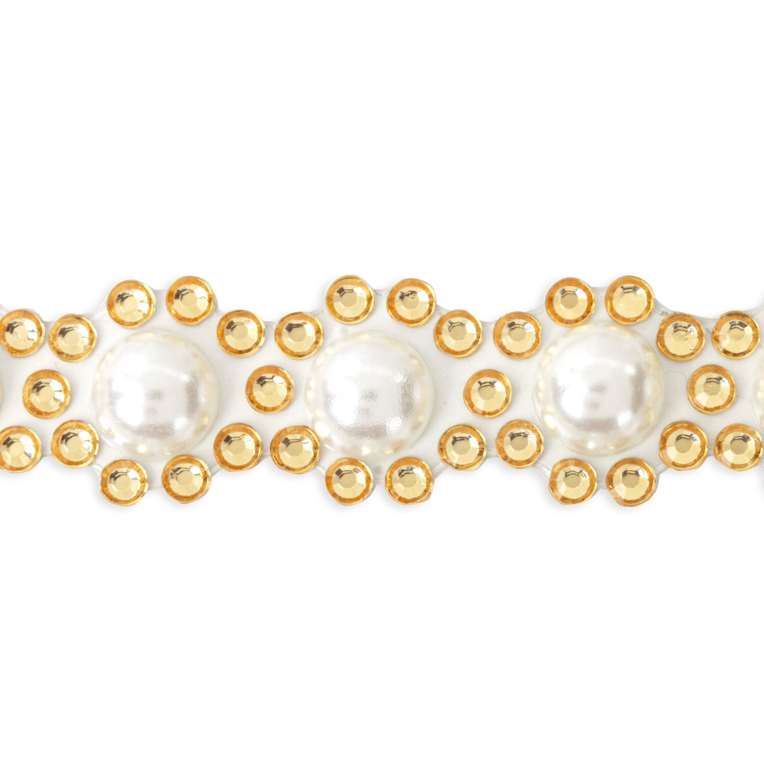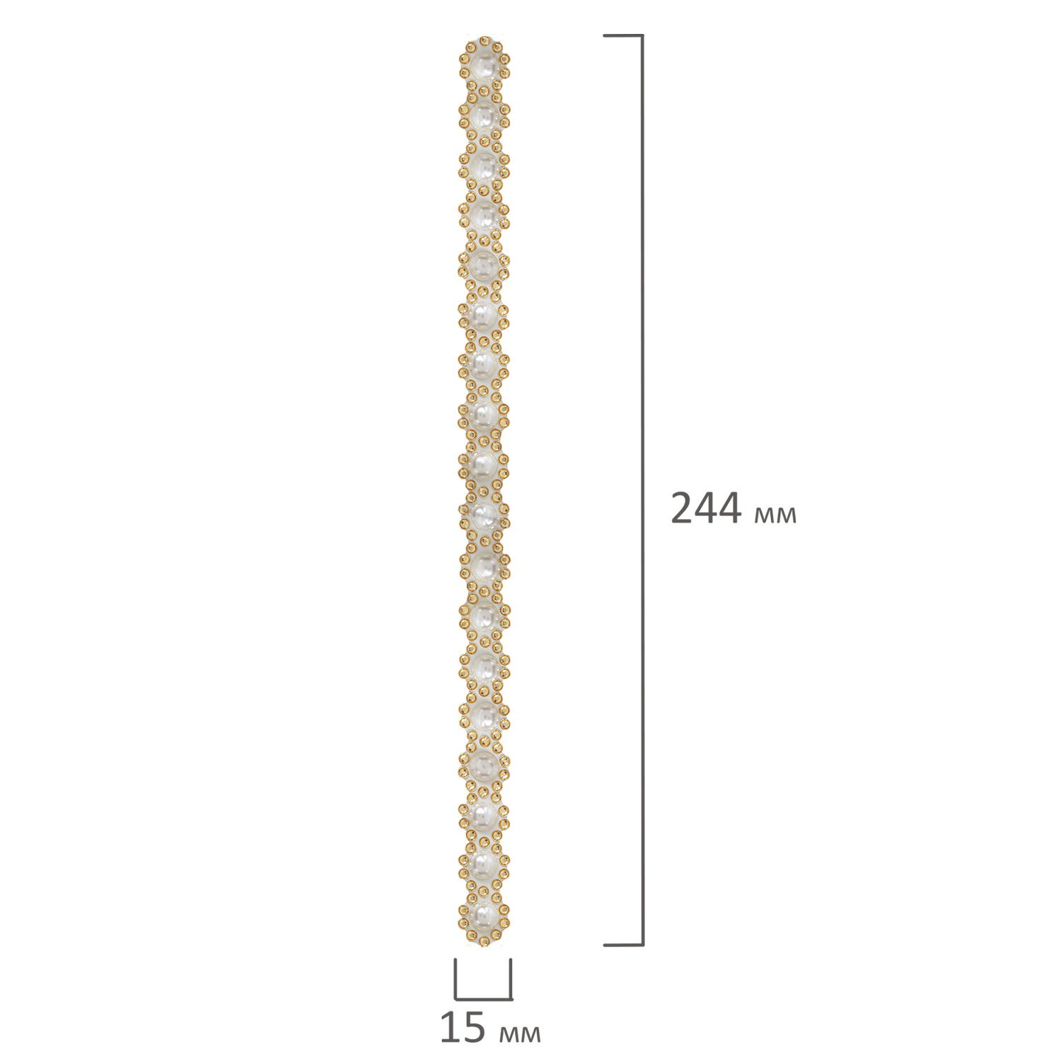 Ленты из страз шириной 15 мм имитируют жемчужины, украшенные вокруг золотистыми стразами. В упаковке содержится 4 ленты длиной 24,3 см, которые помогут изысканно и благородно украсить любые изделия.