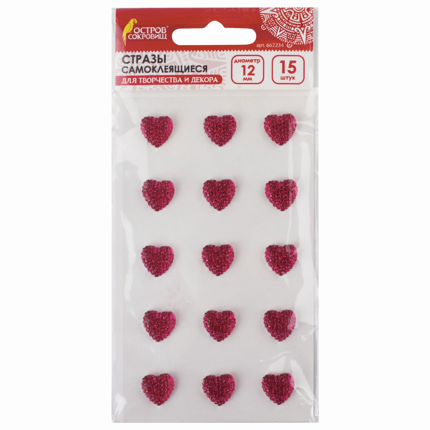 Стразы самоклеящиеся "СЕРДЦА", 12 мм, 15 штук, малиновые, на подложке, ОСТРОВ СОКРОВИЩ, 662234