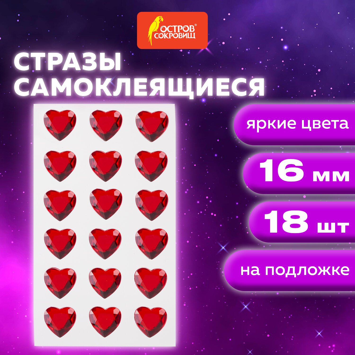 Стразы самоклеящиеся "Сердце", красные, 16 мм, 18 шт., на подложке, ОСТРОВ СОКРОВИЩ, 661579