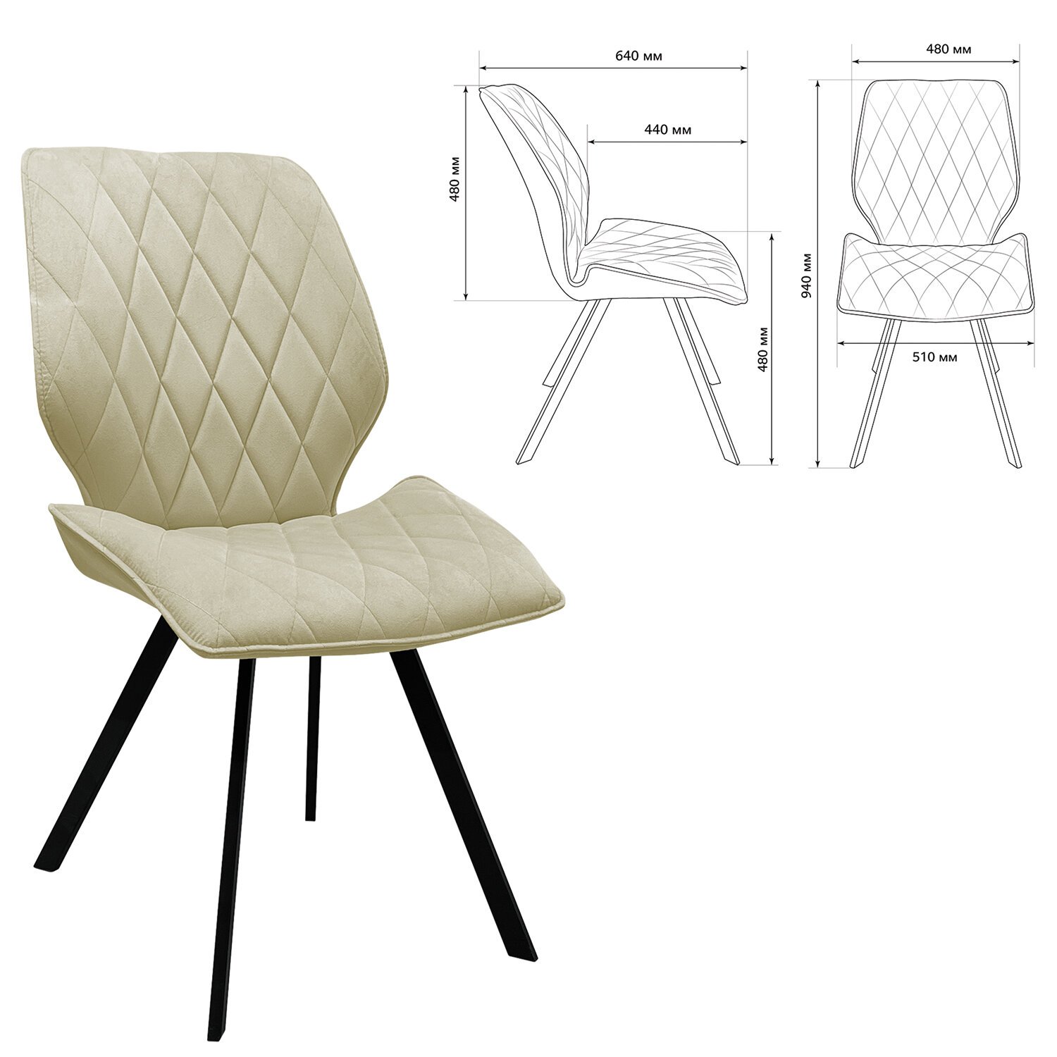 Обивка стульев выполнена стеганой велюровой тканью, отличающейся износостойкостью и практичностью.