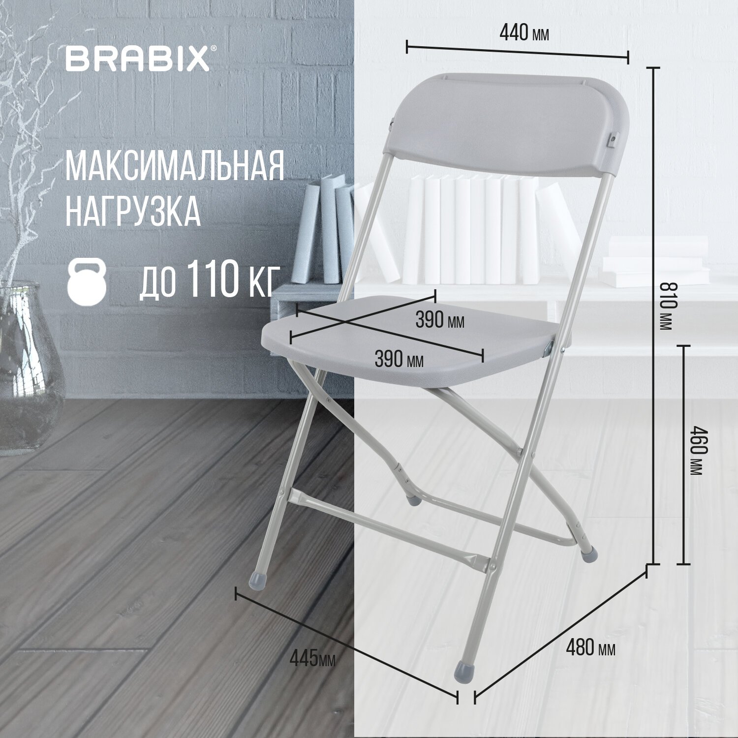 Прочная рама из металла толщиной 1,2 мм обеспечит долговечность эксплуатации, а пластиковые насадки на ножках не дадут испортить напольное покрытие. Модель имеет пластиковую спинку с эргономичным профилем. Складная конструкция сэкономит место при перевозке и хранении. Кресло способно выдерживать нагрузку до 110 кг.