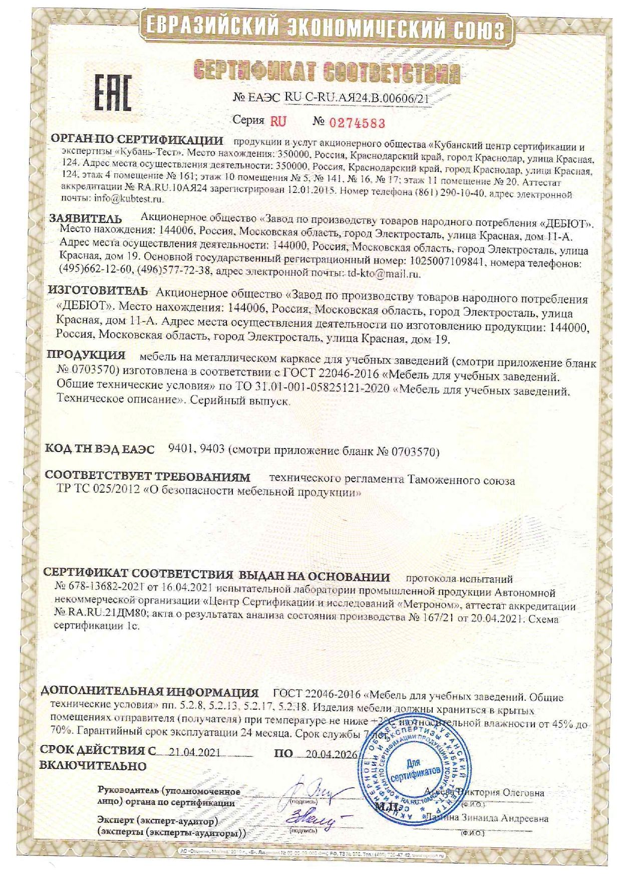 Сиденье и спинка выполнены из формованного березового шпона с учетом требований эргономики, покрыты бесцветным лаком. Каркас изготовлен из труб прямоугольного сечения 20х20 мм и толщиной стенки 1,2 мм, окрашен износостойкой полимерной порошковой краской.
