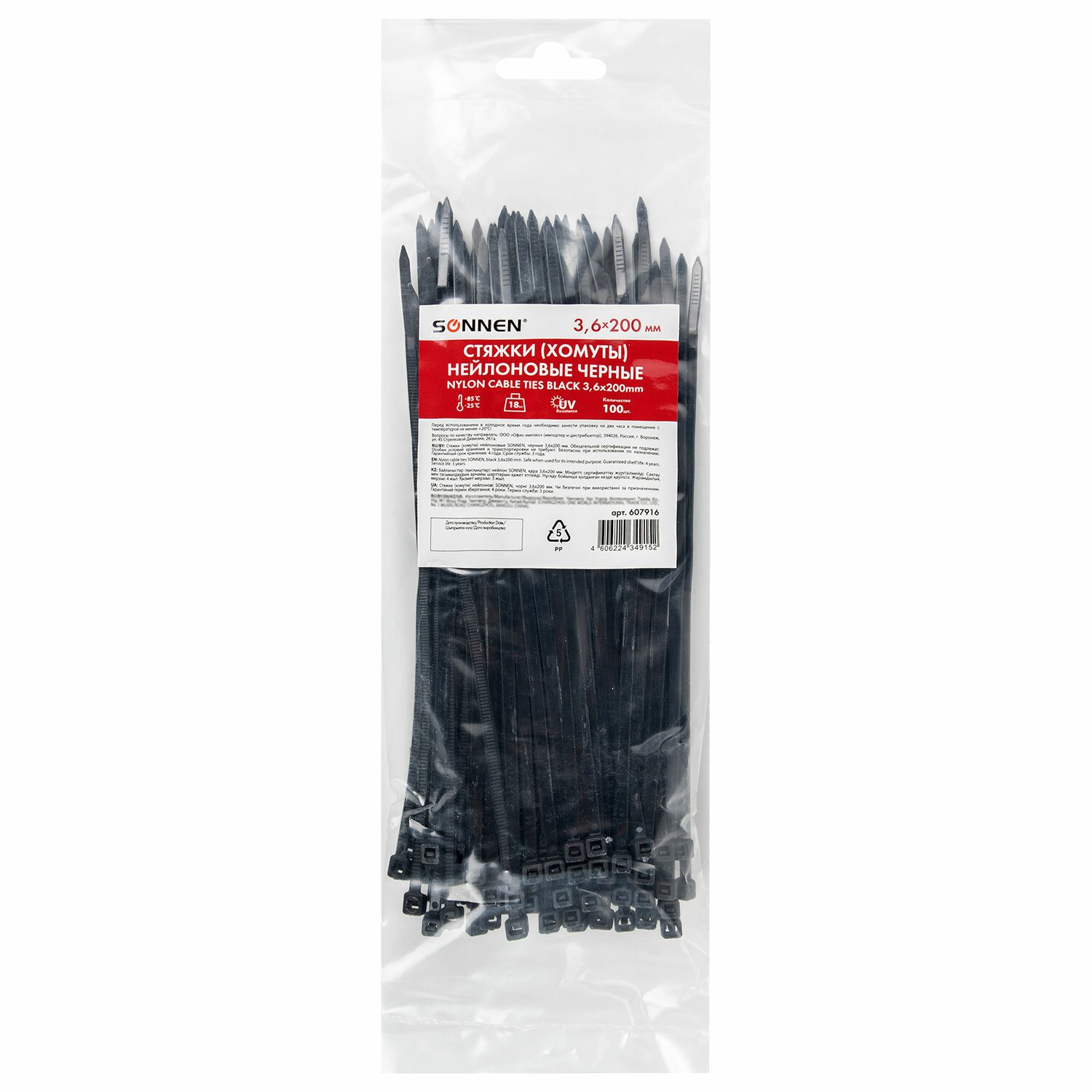 Стяжки (хомуты) нейлоновые сверхпрочные НАБОР 150 шт. (2,5х100/150 мм; 3,6х200 мм), черные, SONNEN, 607924