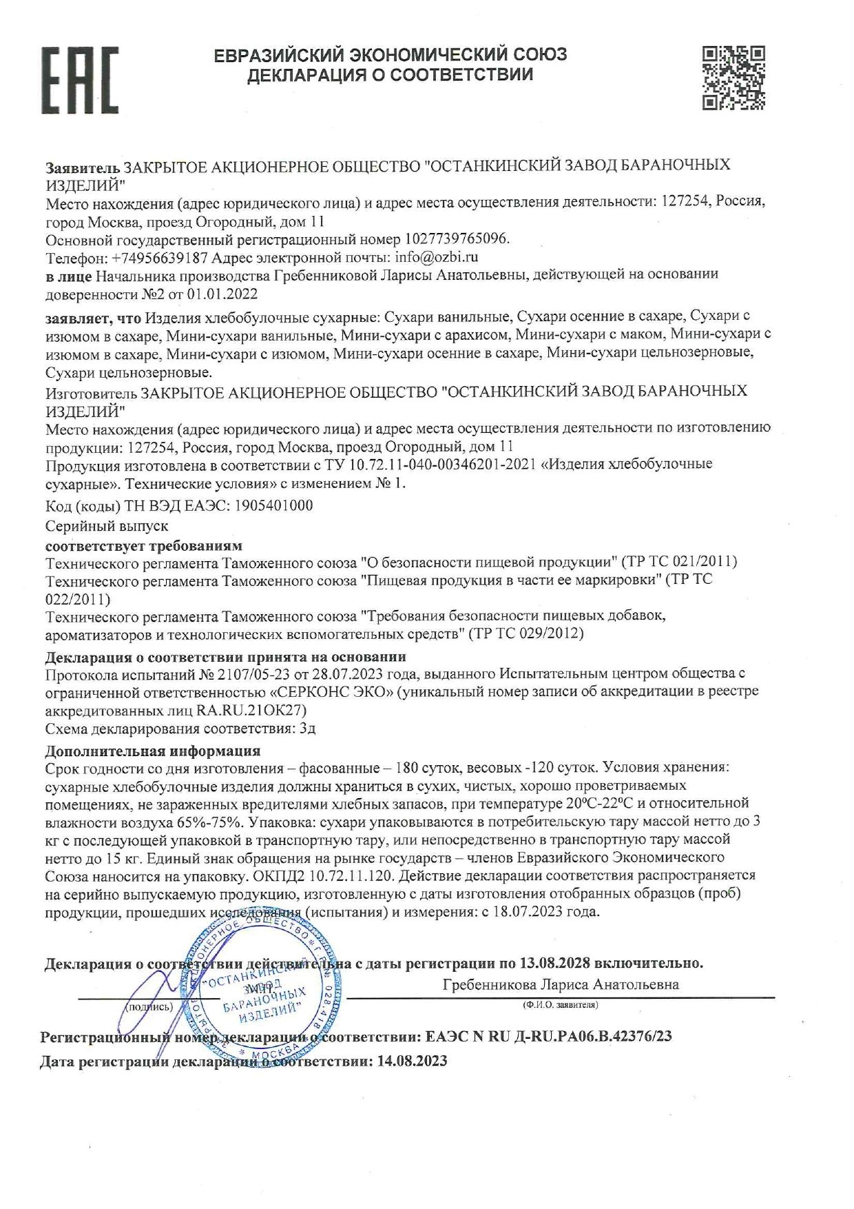 | Соответствует требованиям ГОСТа | ТУ 10.72.11-040-00346201-2021 |