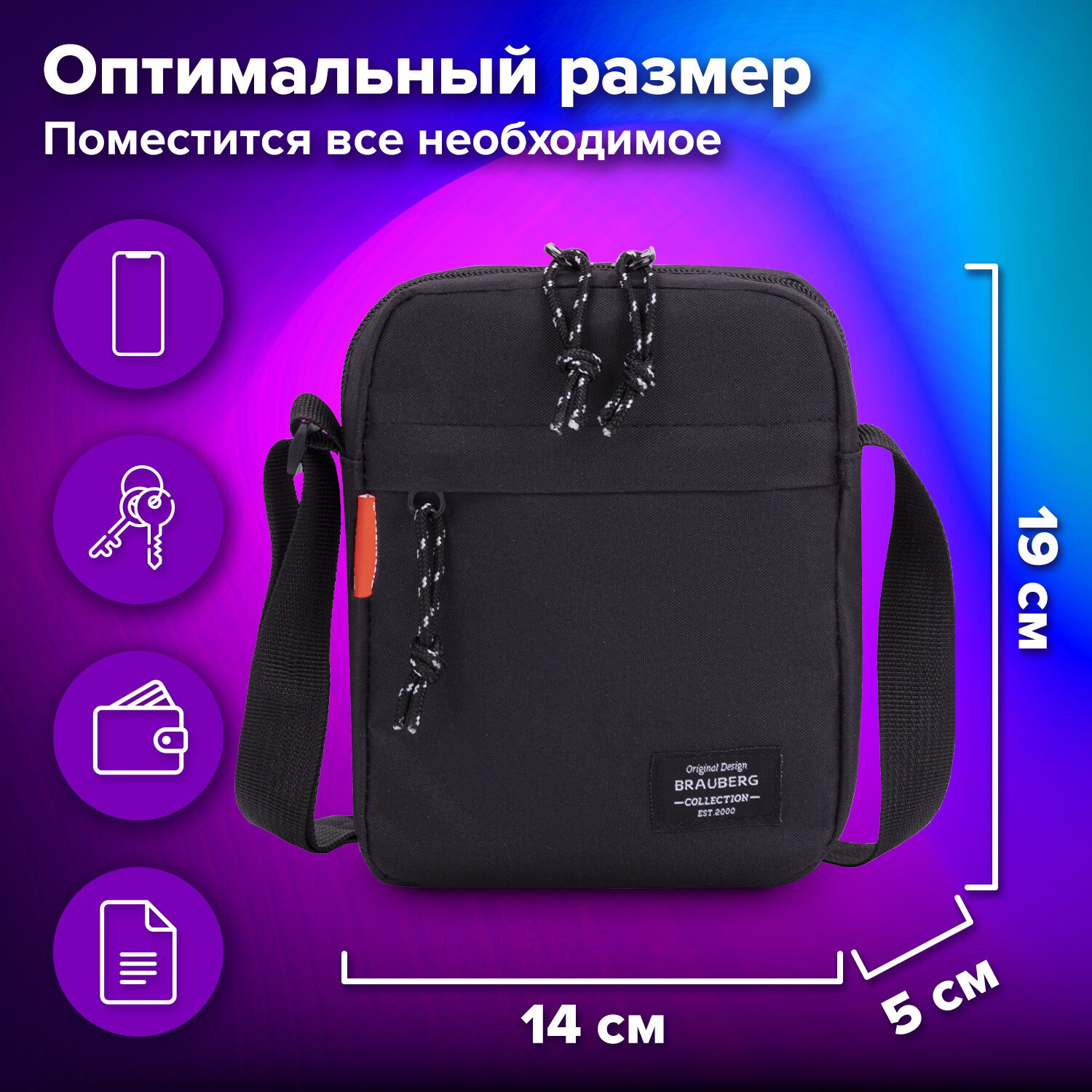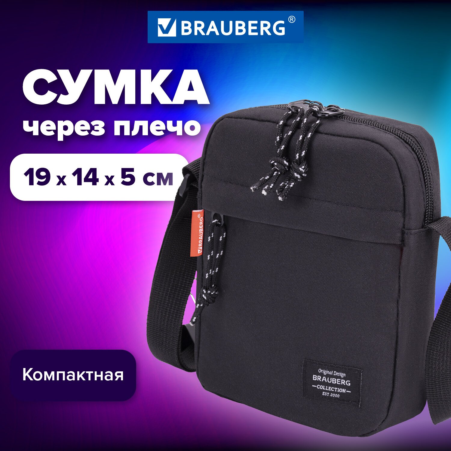 Сумка на плечо BRAUBERG COMPACT, два кармана, черная, 19х14х5 см, 271688
