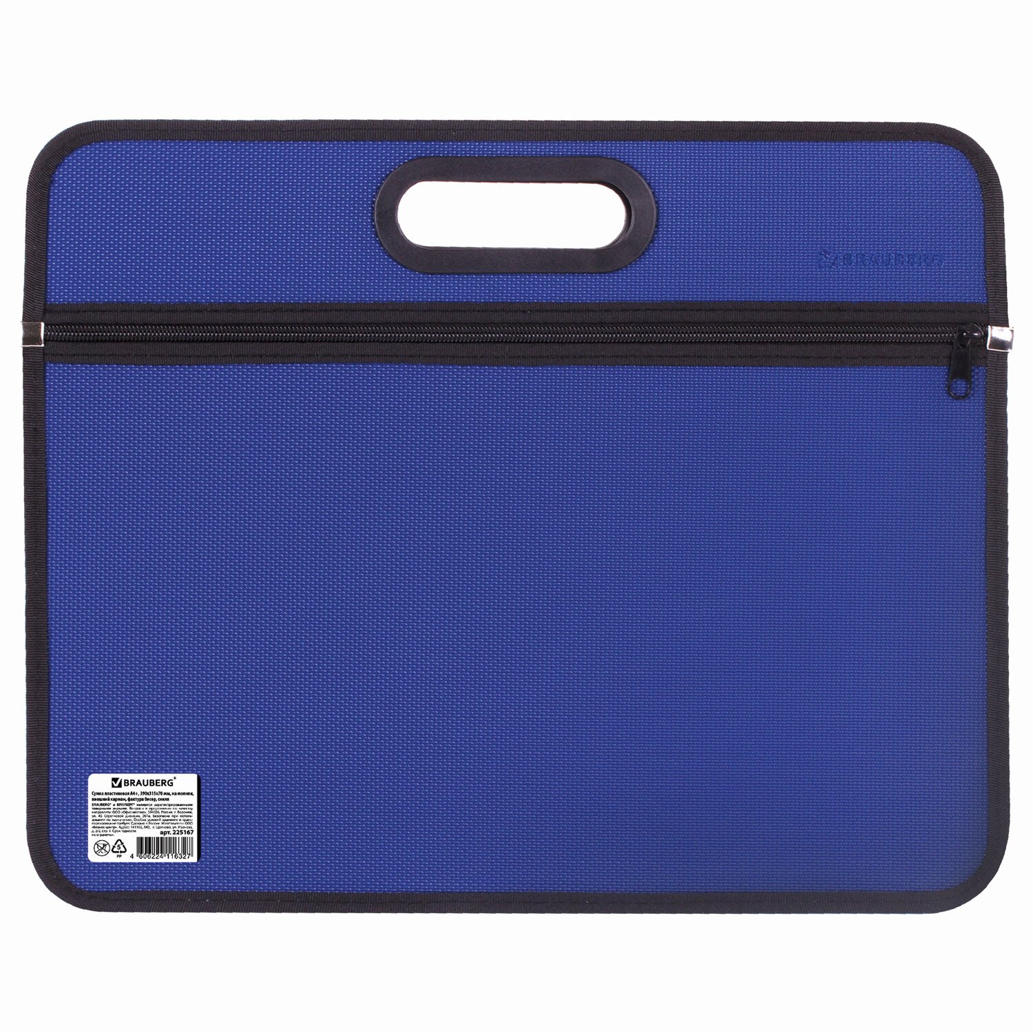 Сумка пластиковая BRAUBERG, А4+, 390х315х70 мм, на молнии, внешний карман, фактура бисер, синяя, 225167