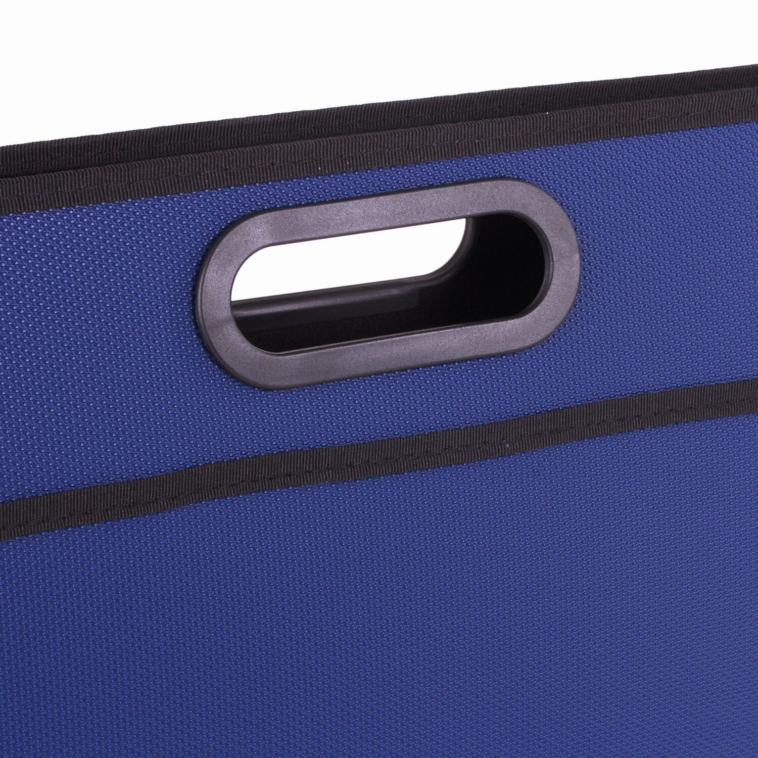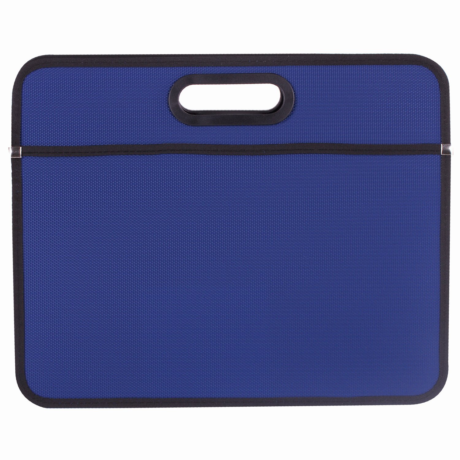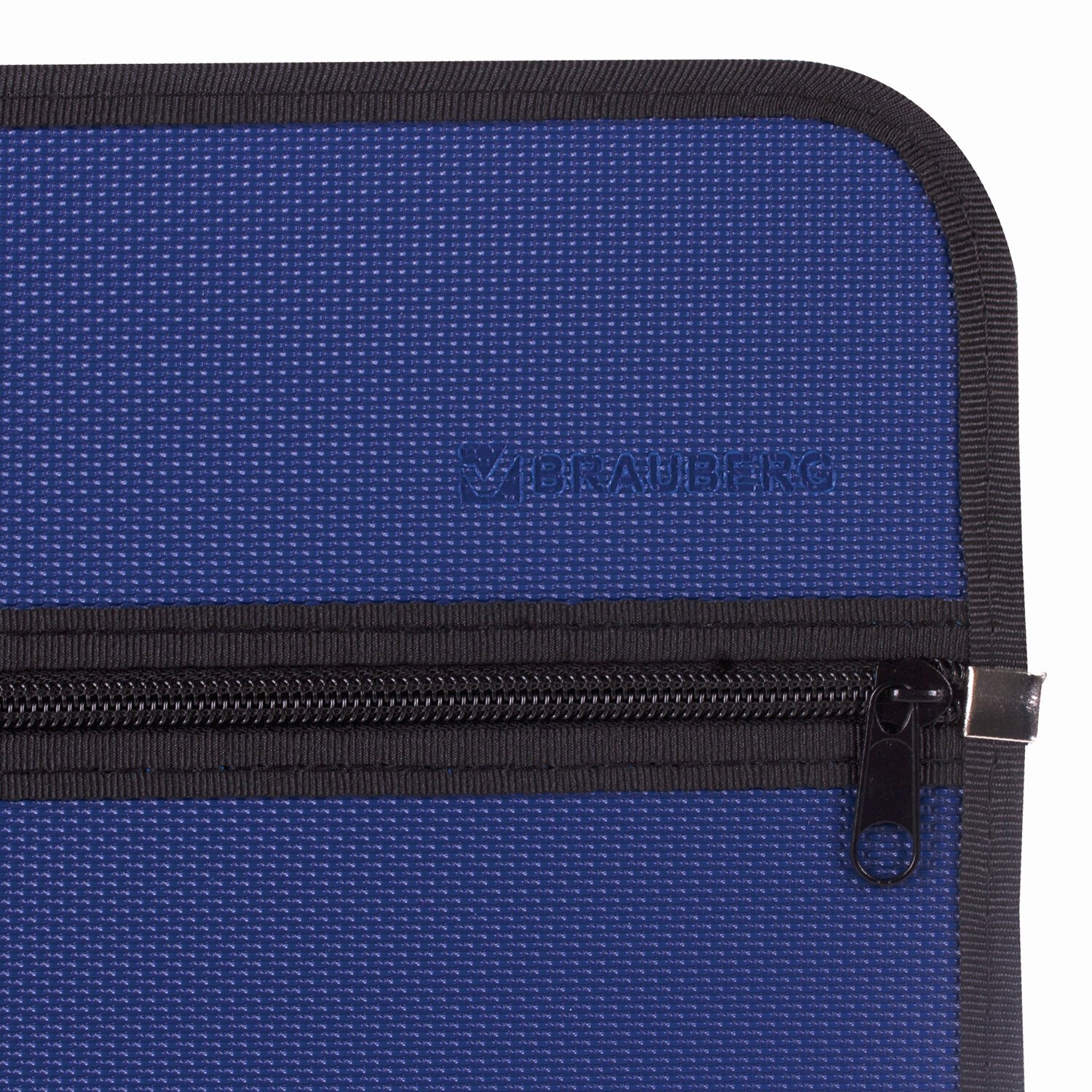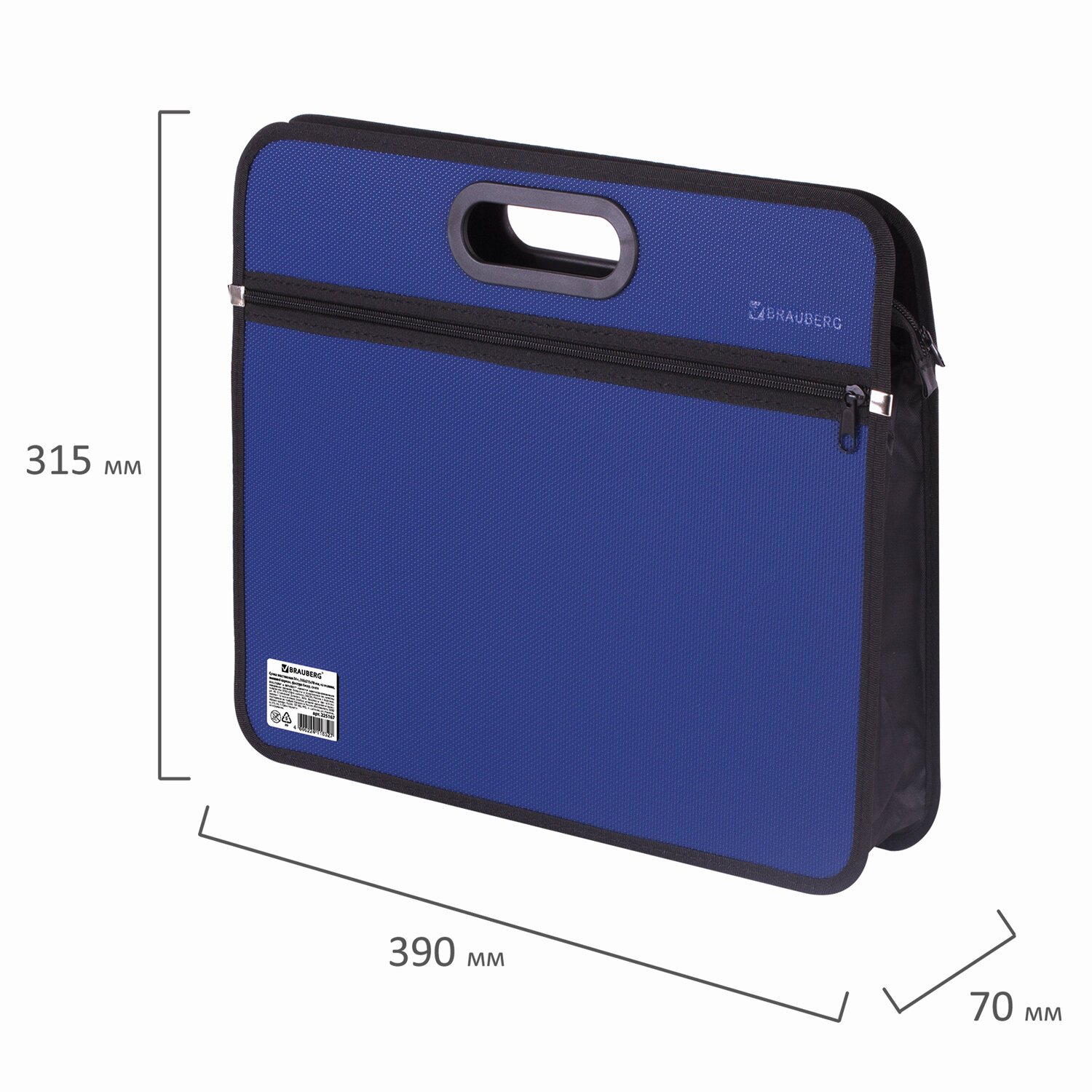 Ручки, находящиеся в корпусе папки, и края окантованы тканью, придавая презентабельный вид изделию. Имеет одно отделение. Материал - жесткий пластик толщиной 0,5 мм. Застегивается на молнию. Есть внешний карман. Формат папки А4+ (390х315х70 мм). Выполнена в синем цвете с фактурой "бисер".