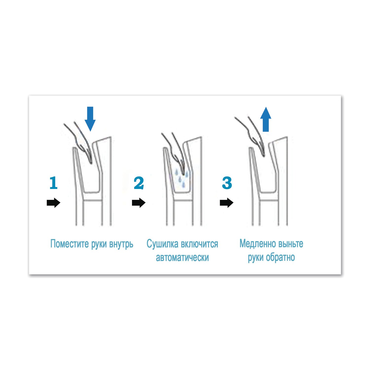 Принцип работы: Вы опускаете руки в рабочую зону, отчего срабатывают сенсорные датчики и вода с рук снимается за 6-9 секунд двумя узконаправленными потоками воздуха со скоростью 95 м/с. Вода с высушенных рук попадает в водосборник объемом 800 мл. Экономично, чисто, современно.