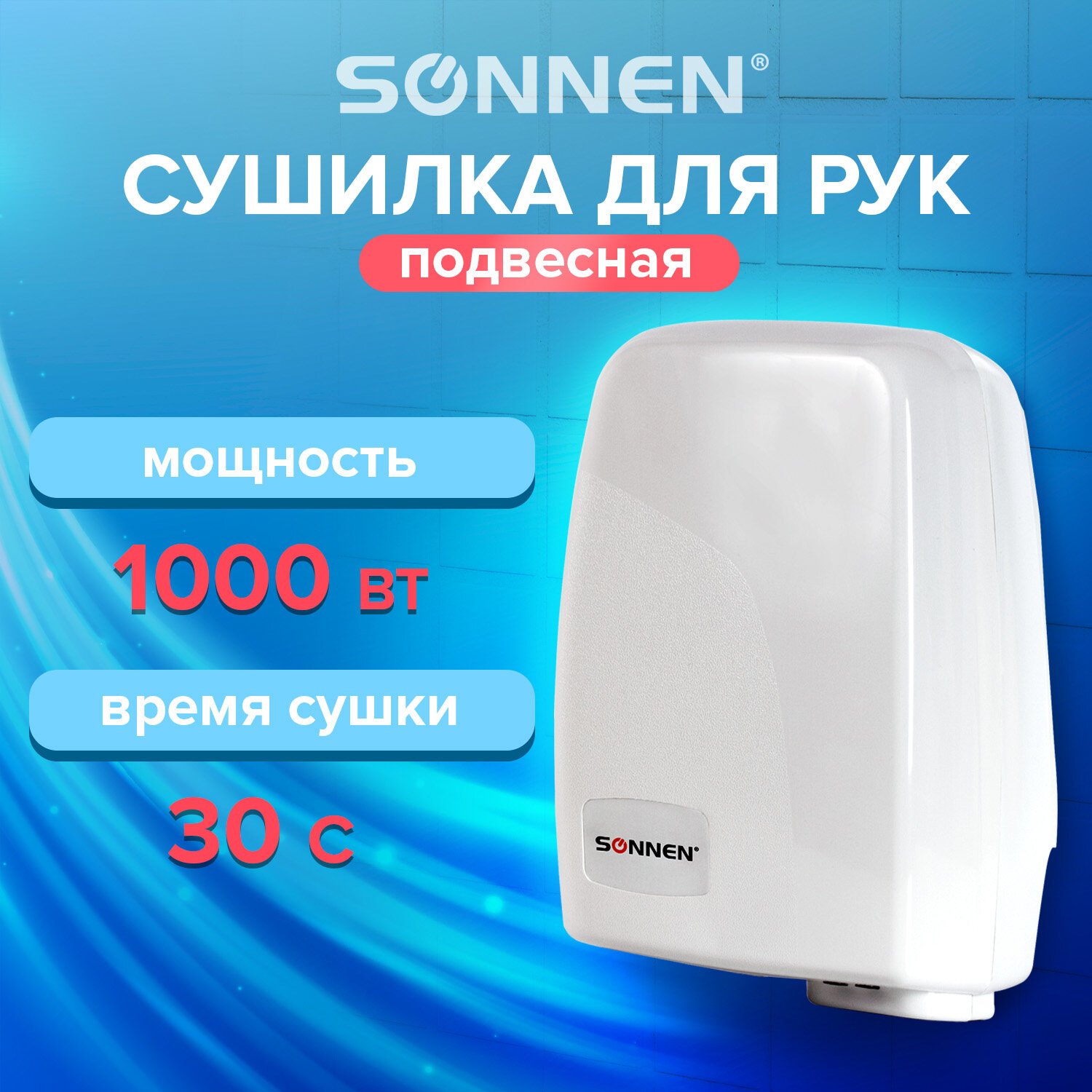 Сушилка для рук SONNEN HD-120, 1000 Вт, пластиковый корпус, белая, 604190