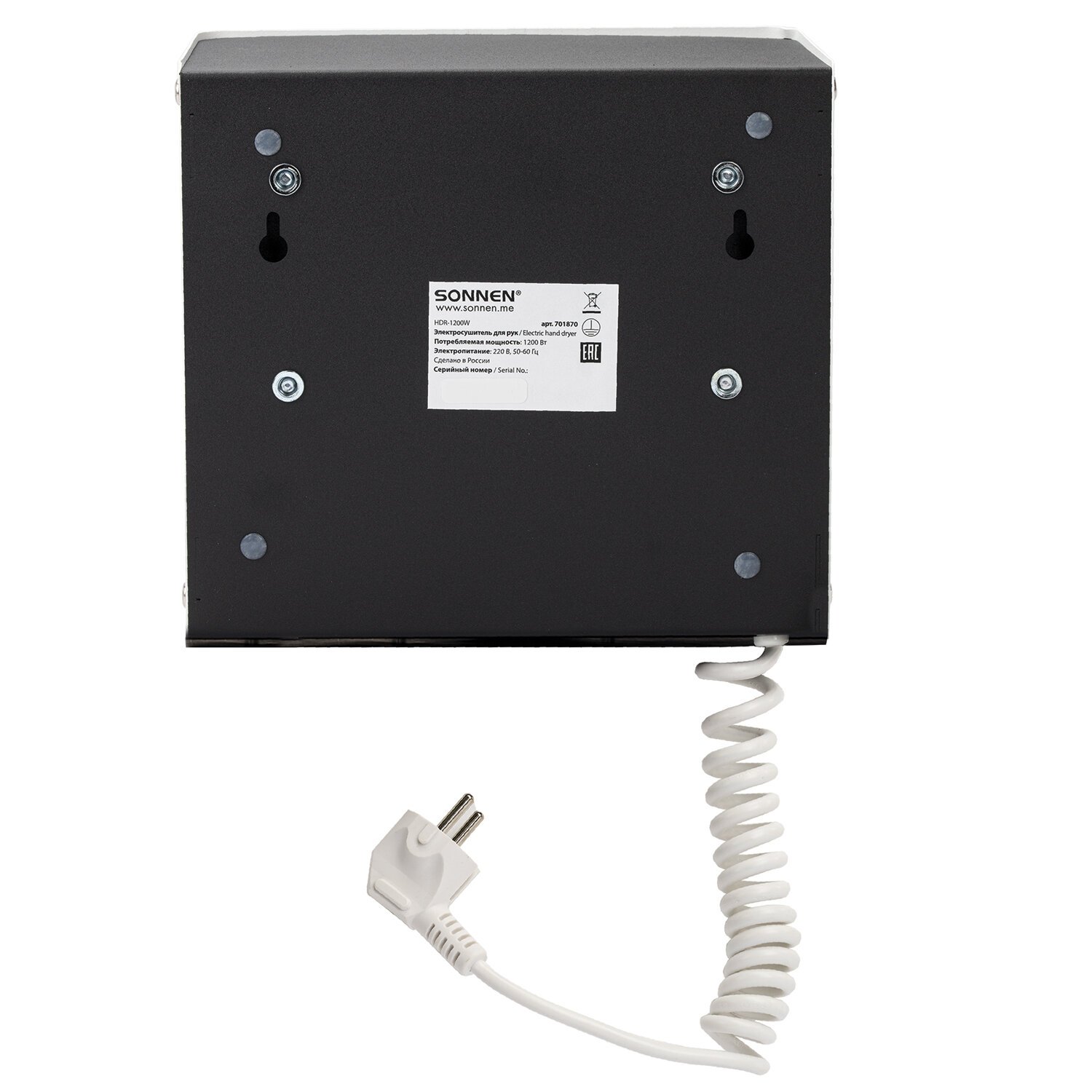 Сушилка для рук SONNEN HDR-12, 1200 Вт, производство РОССИЯ, антивандальная, 12м/с, с, 701870