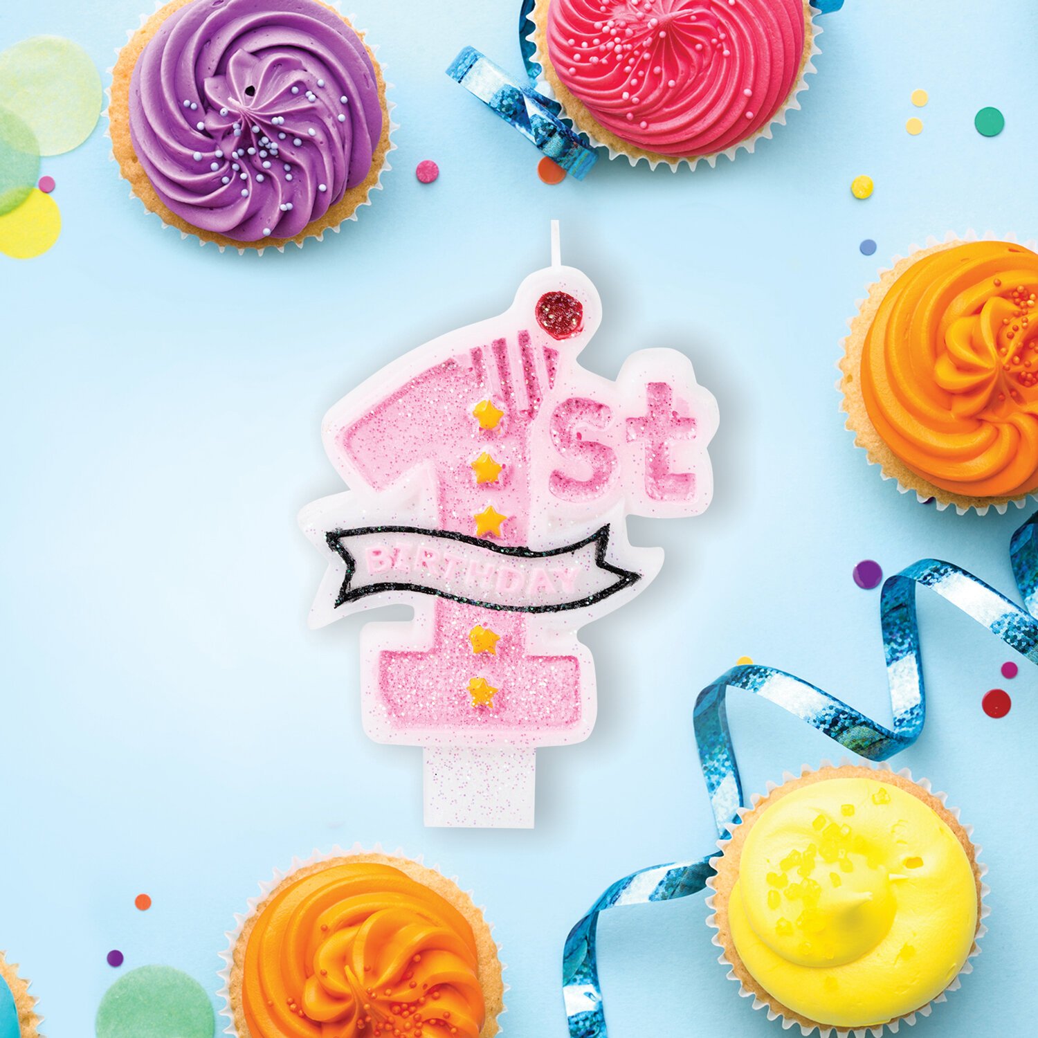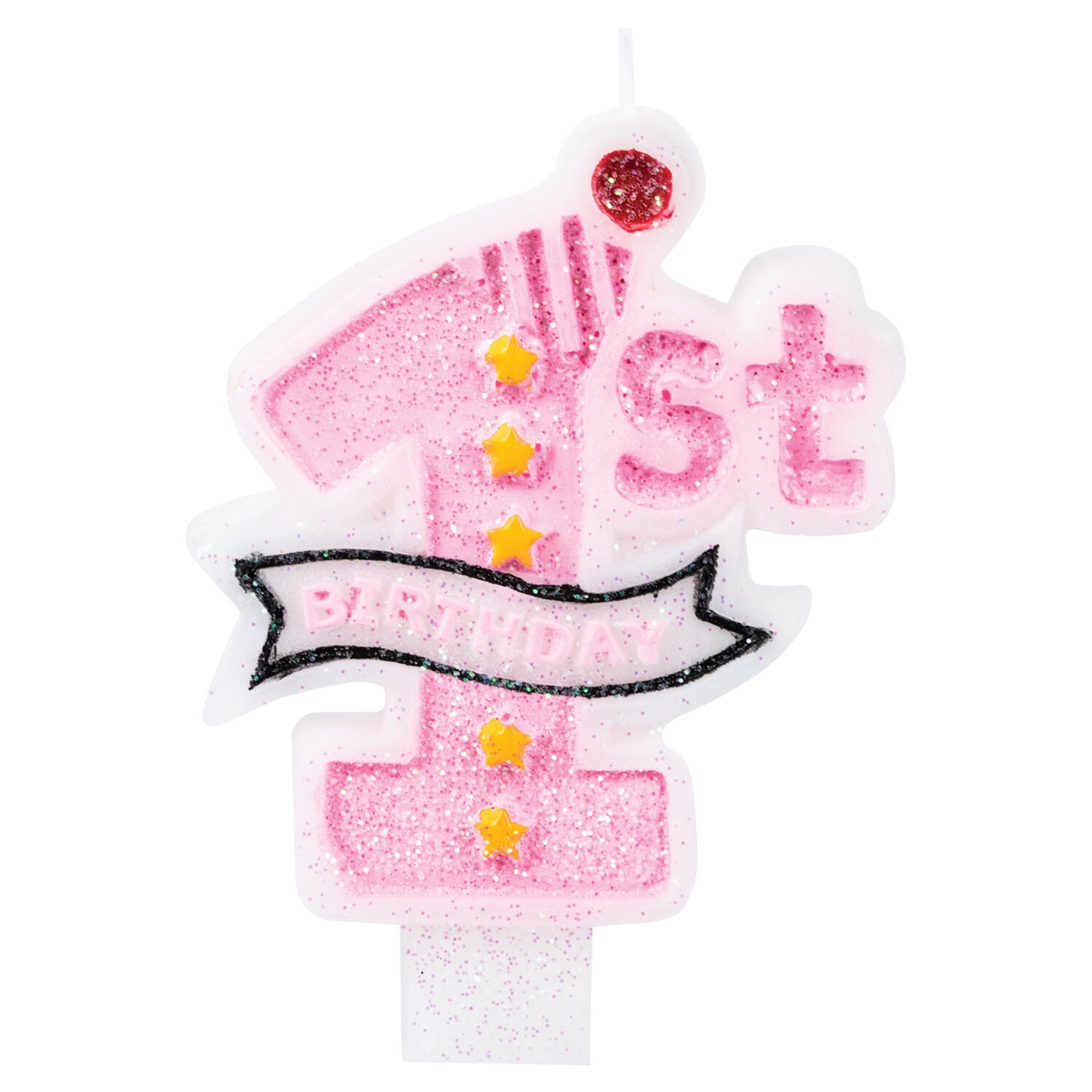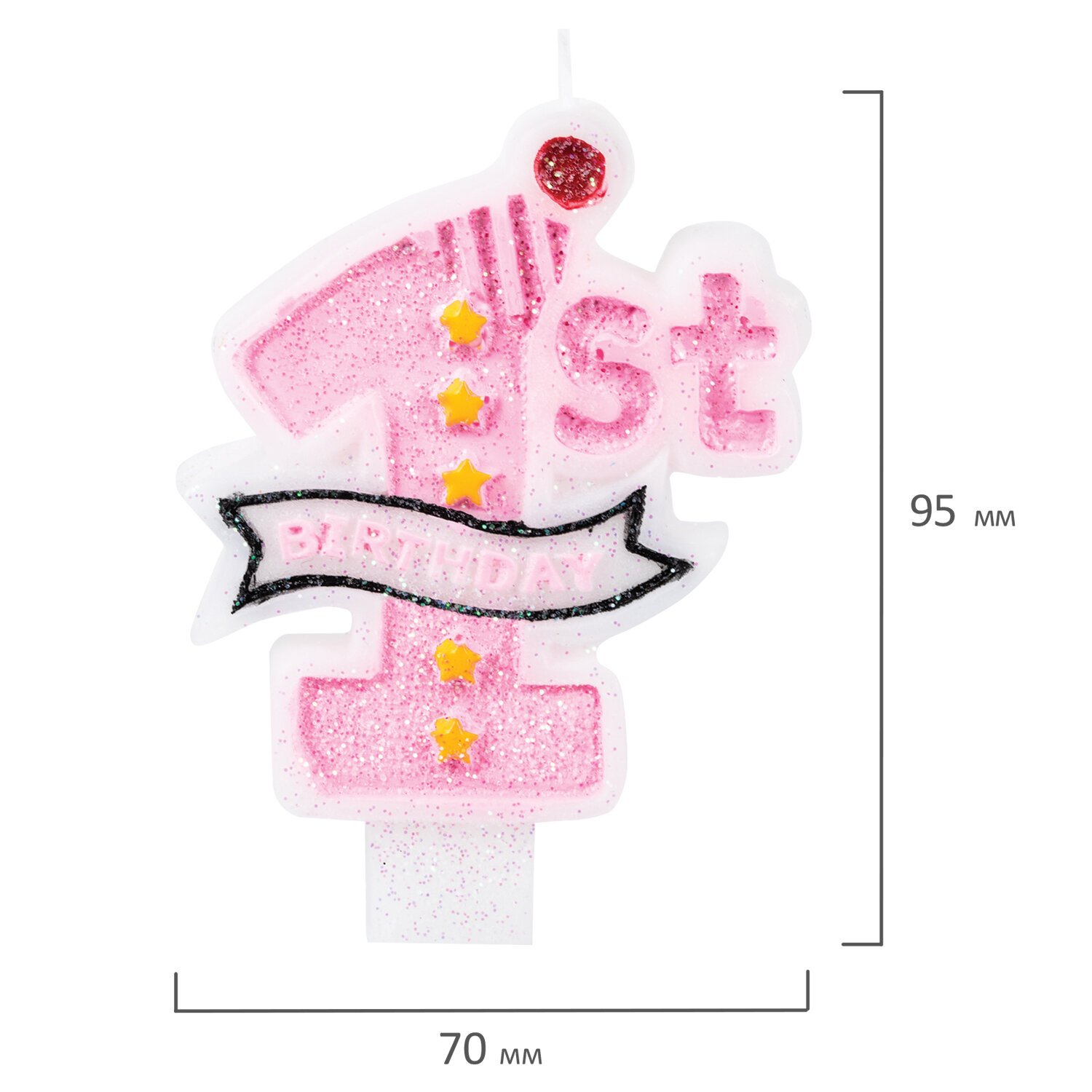 Свеча розового цвета с надписью "Первый день рождения" на английском языке декорирована глиттером и представляет собой цифру "1". Высота свечи - 9,5 см, ширина - 7 см. Материал - парафин.
