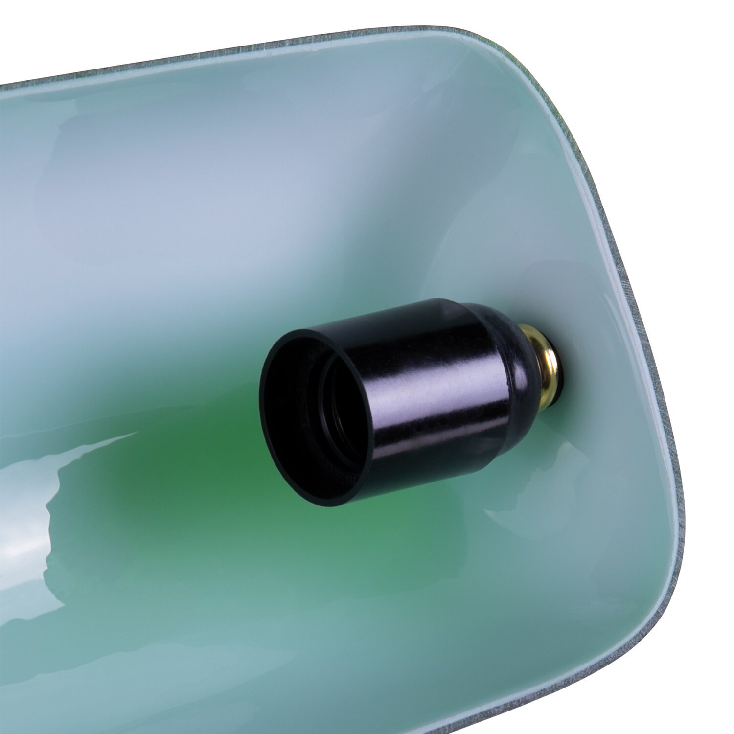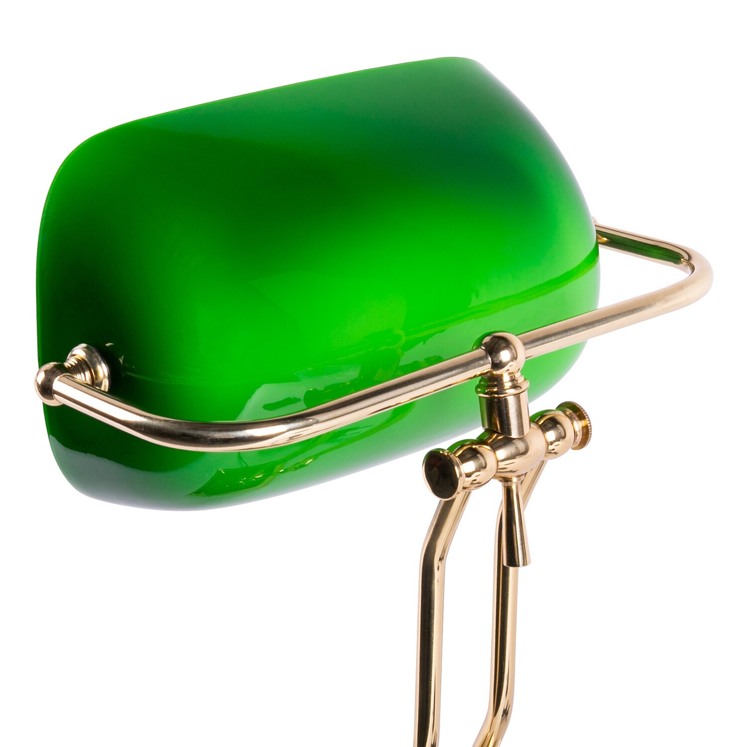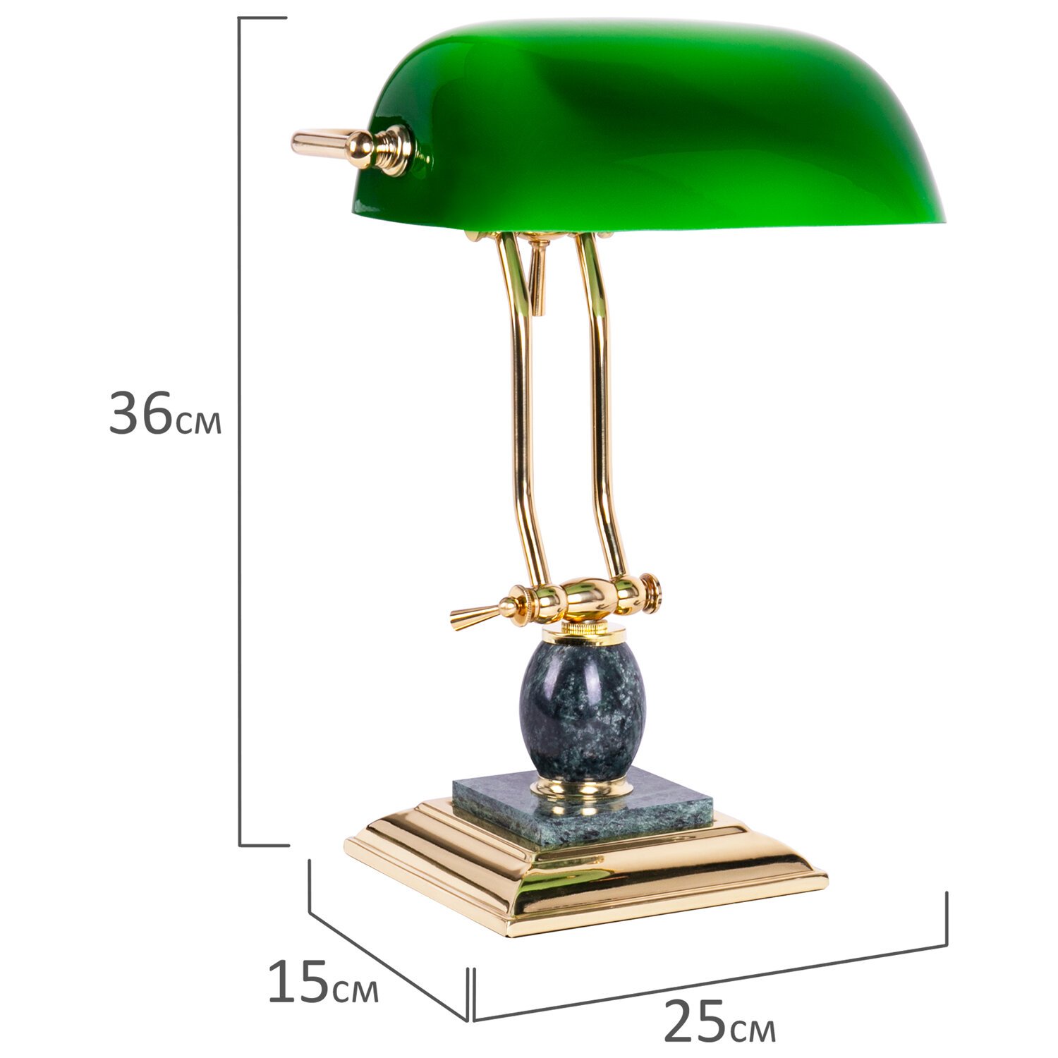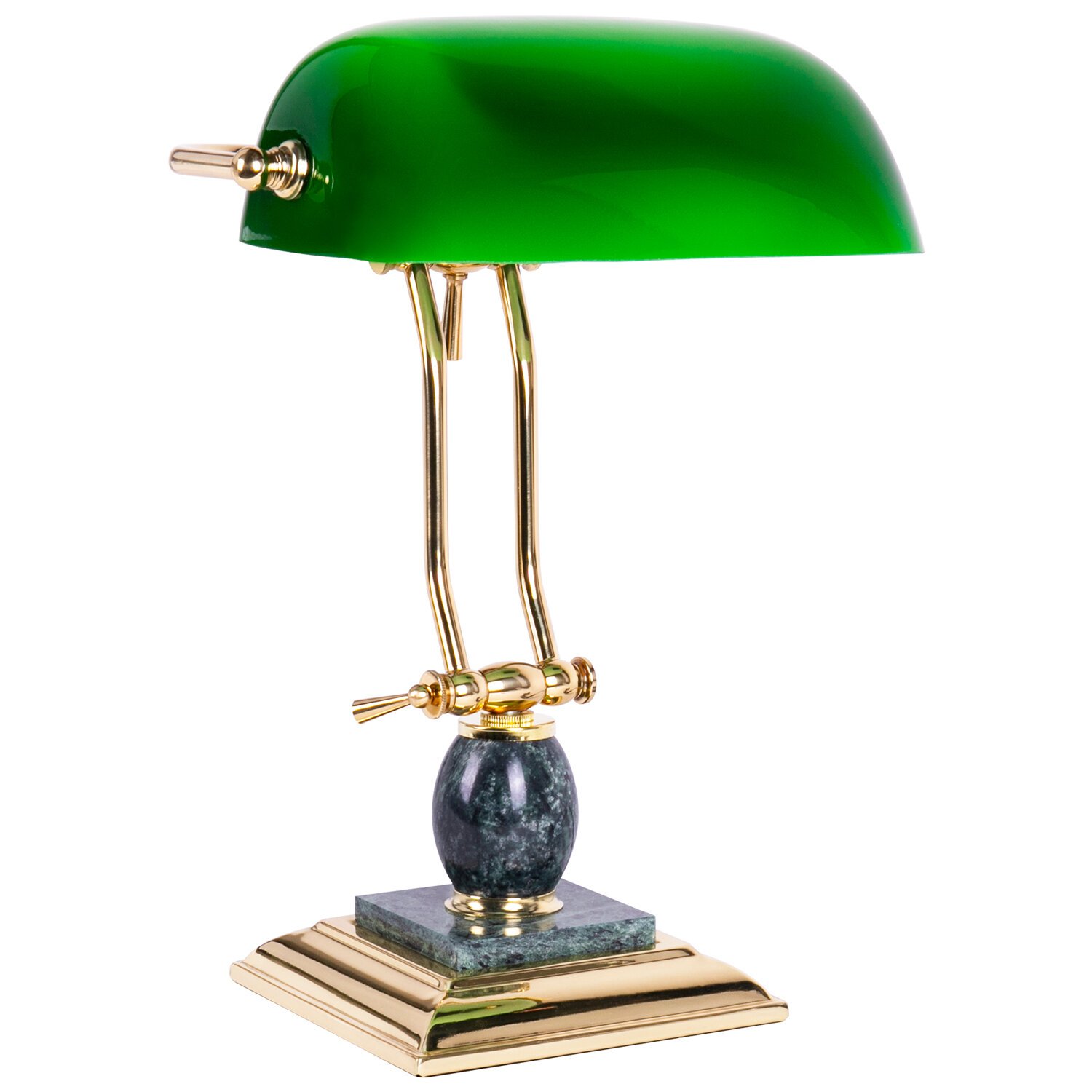 Светильник изготовлен из мрамора зеленого цвета с золотистой отделкой. Имеется возможность регулировки наклона абажура и стойки лампы. Размер светильника (ВхШхГ) – 36х25х15 см. Для светильника используются лампы накаливания мощностью до 60 Вт.