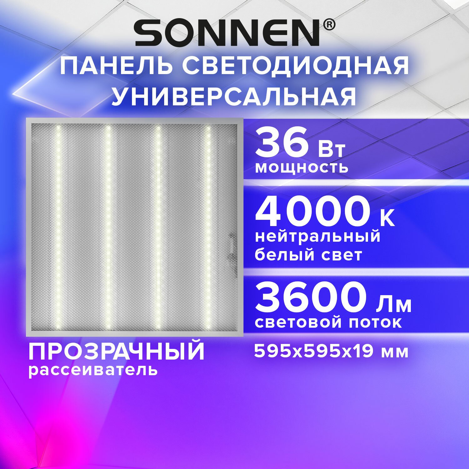Прибор SONNEN освещает пространство со световым потоком, равным 3600 Лм, при цветовой температуре, составляющей 4000 К, благодаря чему подходит для обслуживания большого помещения. Его размеры составляют 595x19x595 мм.