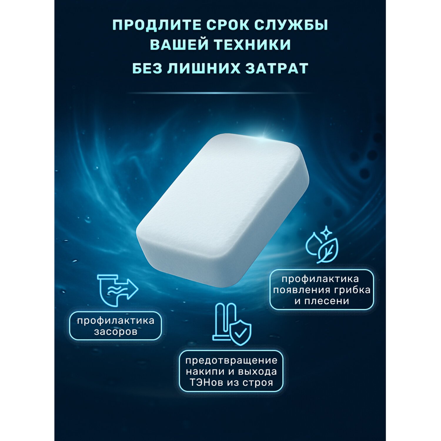 Средство для посудомойки содержит 6 таблеток очистителя для стиральной машины. В зависимости от интенсивности использования и степени загрязнения используйте одну таблетку от 1 раза в месяц.