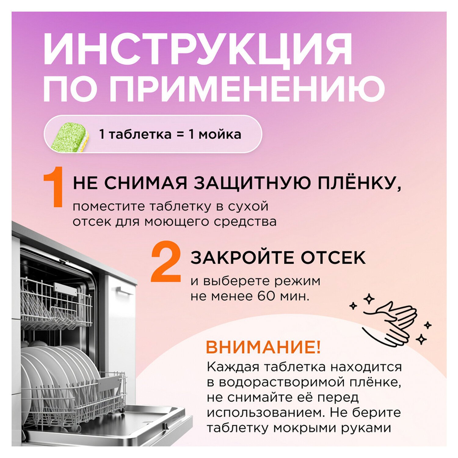 Биоразлагаемые бесфосфатные таблетки для посудомоечных машин SYNERGETIC в водорастворимой пленке – это экологичное, безопасное и эффективное средство. Таблетки предназначены для мытья посуды, в том числе детской, и столовых приборов в посудомоечных машинах любого типа. Комплекс растительных Н-тензидов, полученных из растительных масел, и энзимов без ГМО эффективно размягчает и удаляет стойкие и сложные загрязнения, растворяет жир, качественно и бережно очищает посуду и столовые приборы. Специальные добавки защищают посудомоечную машину от накипи, предотвращают повторное оседание загрязнений, придают посуде сияющий блеск, не оставляя разводов и известкового налета. Все компоненты средства полностью смываются водой. Благодаря уникальной формуле all in one при использовании таблеток не требуется добавление соли и ополаскивателя, но для достижения максимального результата и при очень жесткой воде рекомендуется применение специальной соли и ополаскивателя SYNERGETIC. Таблетки не содержат фосфатов, фосфонатов, агрессивных ПАВ, искусственных ароматизаторов.