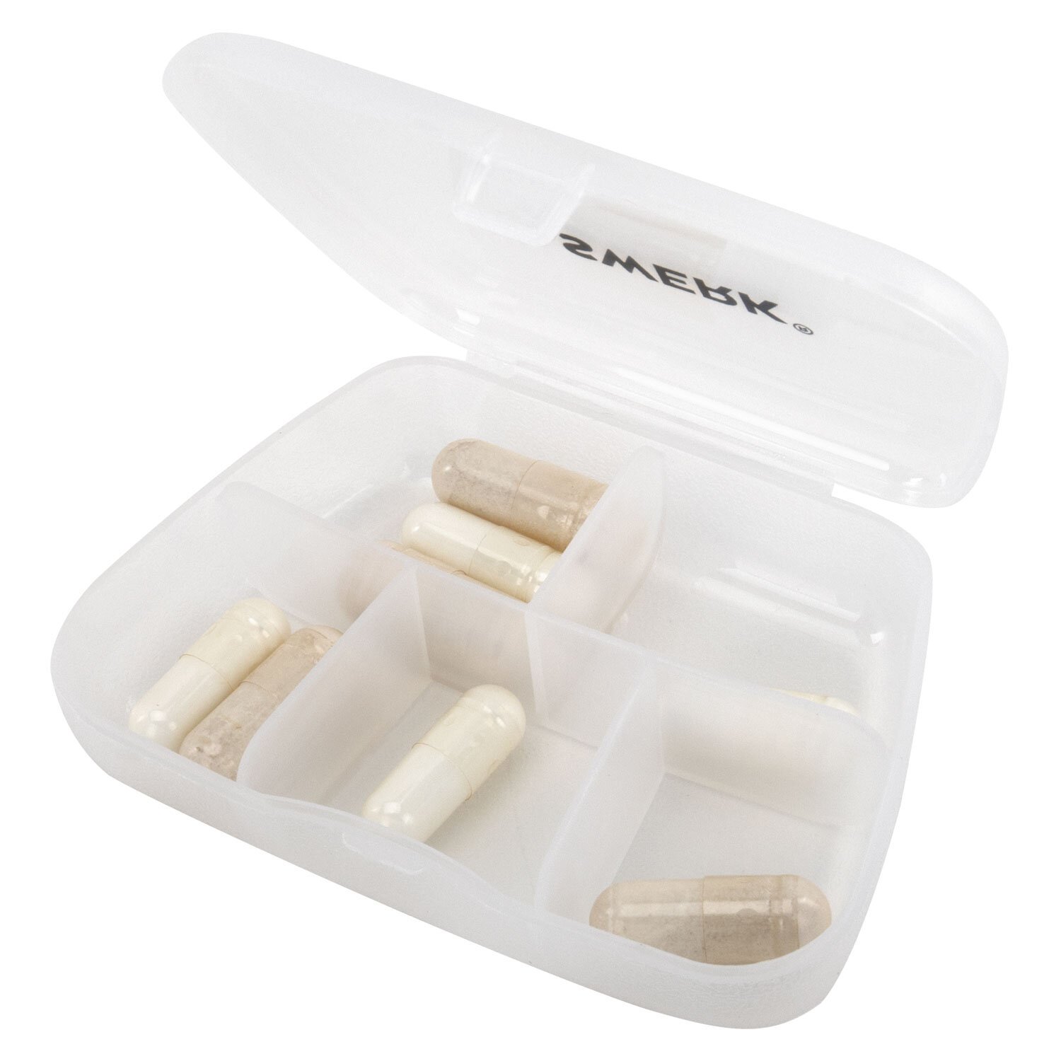 Таблетница представляет собой прозрачный пластиковый контейнер с 5 отсеками, достаточно вместительными для хранения ежедневного приема лекарств. Крышка контейнера плотно и надежно защелкивается, предотвращая рассыпание содержимого.