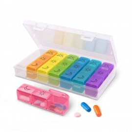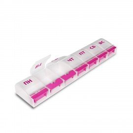Таблетница представляет собой контейнер с 14 вместительными отделениями, промаркированными по дням недели и суточному режиму приема: утро, вечер. Для удобства крышки утренних и вечерних отсеков отличаются цветом.