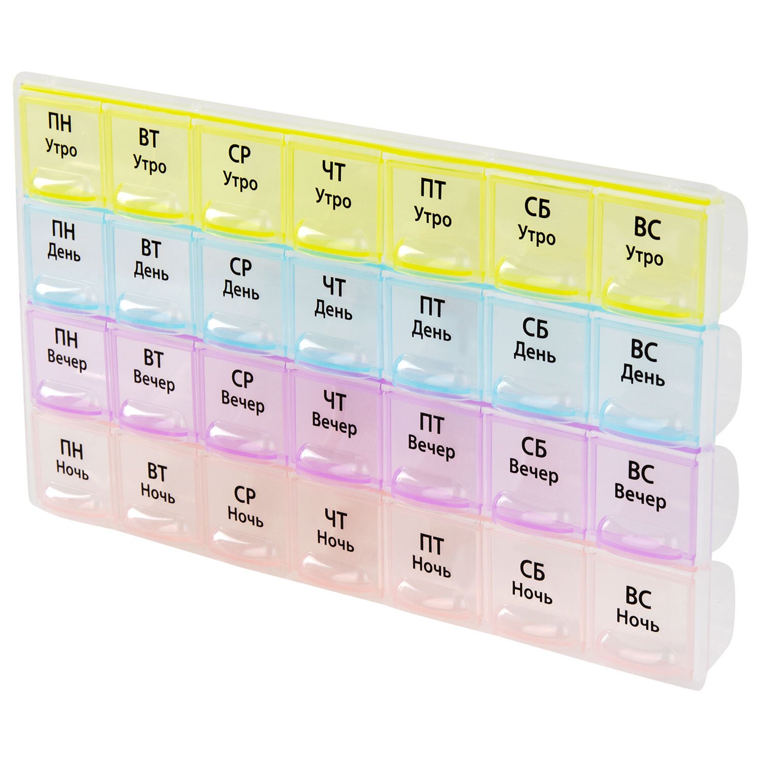 Отделения промаркированы крупным шрифтом по дням недели и суточному режиму приема: утро, день, вечер, ночь. Маркировка выполнена на русском языке при помощи специальной УФ печати. Надписи не сотрутся от длительного и частого использования.