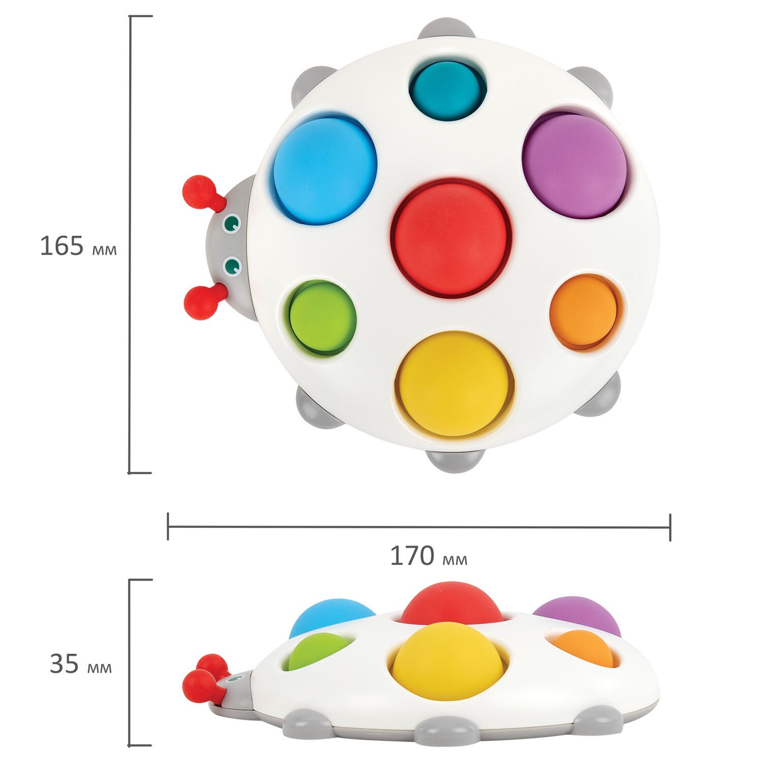 Тактильная сенсорная развивающая игрушка "Букашка"- яркая, качественная и приятная на ощупь. Она поможет самым маленьким познать окружающий мир при помощи сенсорики. Яркие кнопки разного цвета и диаметра помогут изучить малышу основные цвета в форме игры.