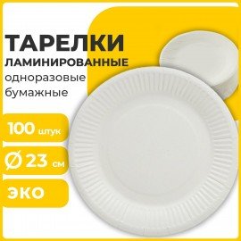 Тарелка одноразовая бумажная 230 мм, 100 штук, СТАНДАРТ, жиростойкая ламинированная, LAIMA, 608086