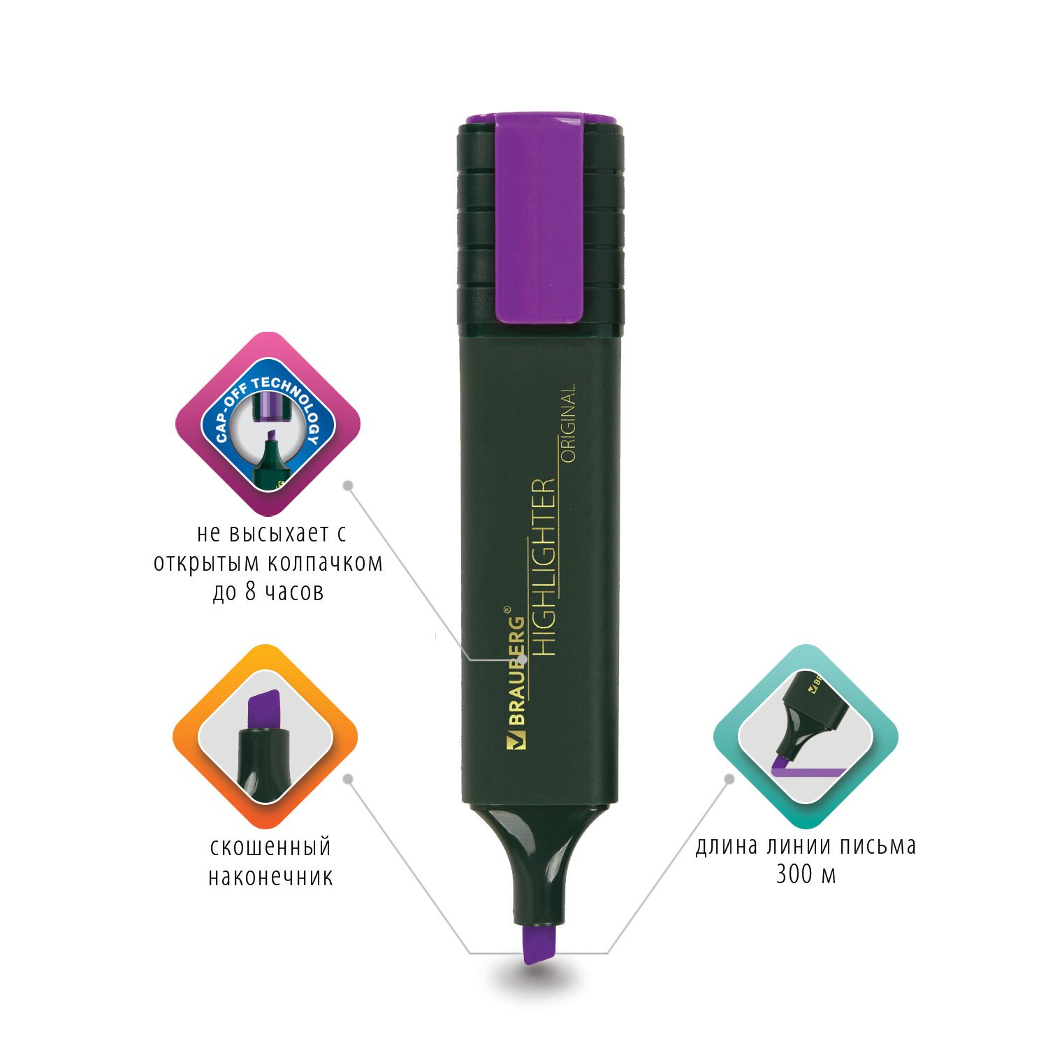 Текстовыделитель фиолетового цвета имеет плоскую форму корпуса, диаметр которого 25 мм. Скошенный наконечник имеет толщину линии письма от 1 до 5 мм, что обеспечивает удобство при работе с текстом, напечатанным мелким шрифтом, или таблицами. Благодаря особой водной основе чернил текстовыделитель не высыхает без колпачка в течение 8 часов. Текстовыделитель обладает экономным расходом чернил, при этом длина линии письма достигает 300 метров. Чернила быстро впитываются и тем самым предотвращают размазывание в процессе использования. Светоустойчивые чернила не выцветают даже на открытом солнце. Цвет клипа текстовыделителя соответствует цвету чернил.