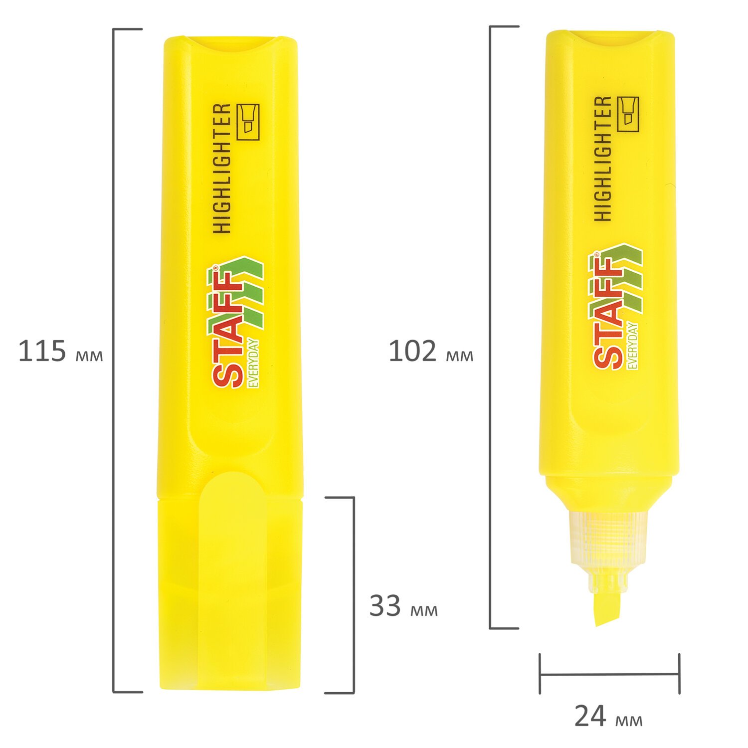 Текстовыделитель желтого цвета обладает прямоугольной формой корпуса диаметром 26 мм. Корпус оснащен удобной зоной захвата. Скошенный наконечник имеет толщину линии письма от 1 до 5 мм, что обеспечивает удобство при работе с текстом, напечатанным мелким шрифтом, или таблицами.