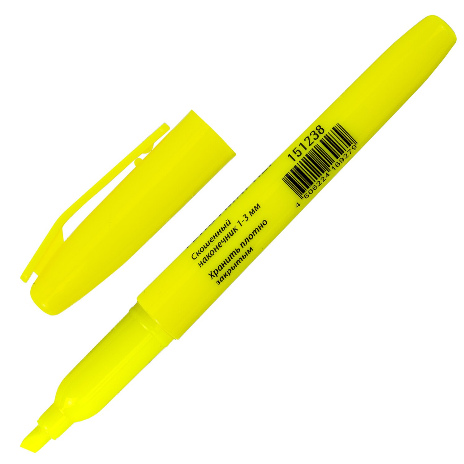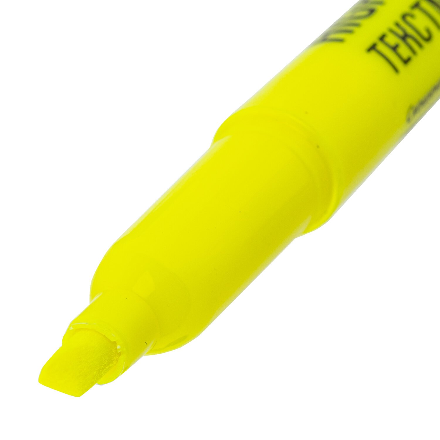 Текстовыделитель желтого цвета обладает круглой формой корпуса диаметром 12 мм. Корпус тектовыделителя оснащен удобной зоной захвата. Скошенный наконечник имеет толщину линии письма от 1 до 3 мм, что обеспечивает удобство при работе с текстом, напечатанным мелким шрифтом, или таблицами. Текстовыделитель обладает экономным расходом чернил. Светоустойчивые чернила на водной основе не выцветают даже на открытом солнце и не размазываются в процессе использования. Изделие не перезаправляется. Корпус с колпачком соответствует цвету чернил.