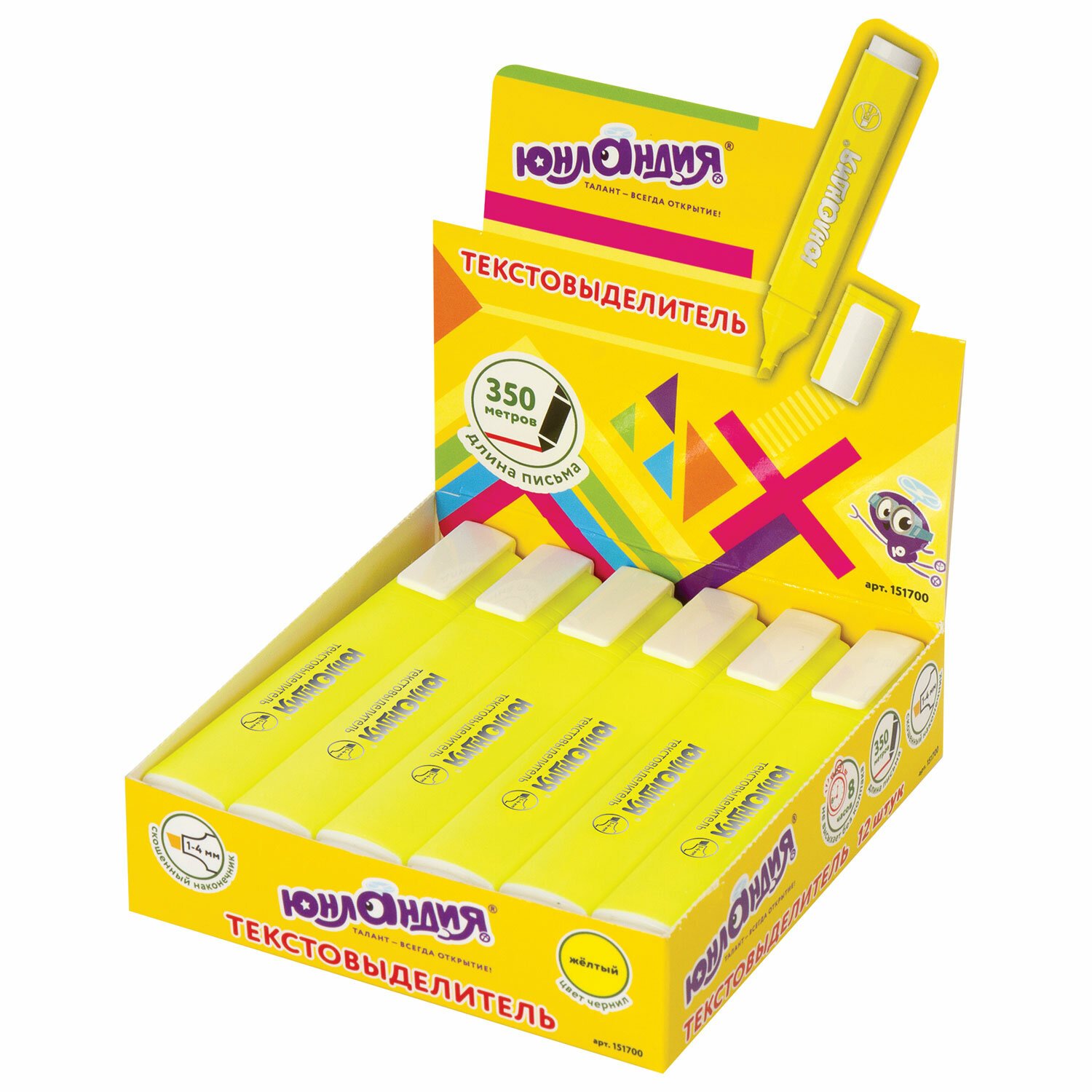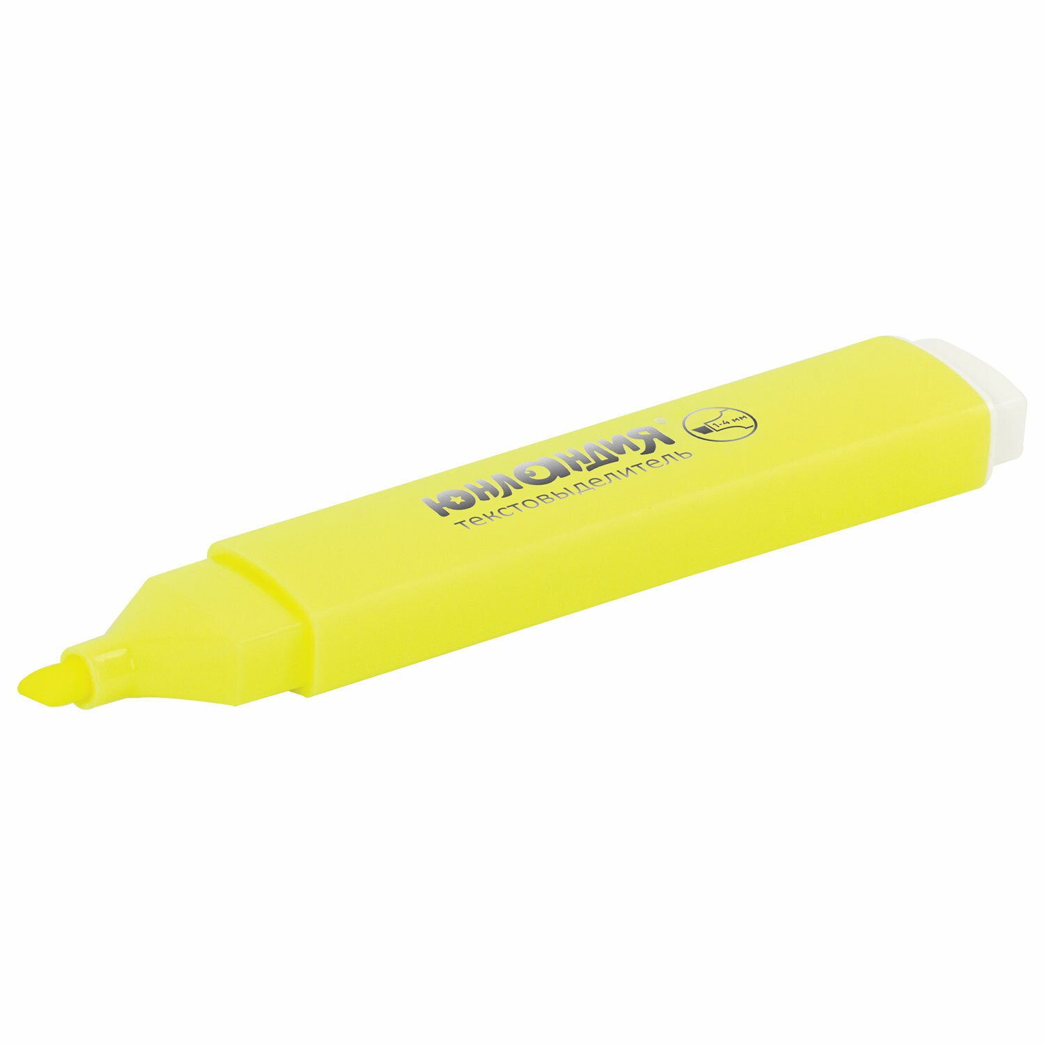 Текстовыделитель желтого цвета имеет плоскую форму корпуса, диаметр которого 18 мм. Неоновый цвет позволяет ярко выделить важное в тексте. Скошенный наконечник имеет толщину линии письма от 1 до 4 мм, что обеспечивает удобство при работе с текстом, напечатанным мелким шрифтом, или таблицами. Благодаря особой водной основе чернил текстовыделитель не высыхает без колпачка в течение 8 часов. Текстовыделитель обладает экономным расходом чернил, при этом длина линии письма достигает 350 метров. Чернила быстро впитываются и тем самым предотвращают размазывание в процессе использования. Светоустойчивые чернила не выцветают даже на открытом солнце. Цвет колпачка и корпуса соответствует цвету чернил.
