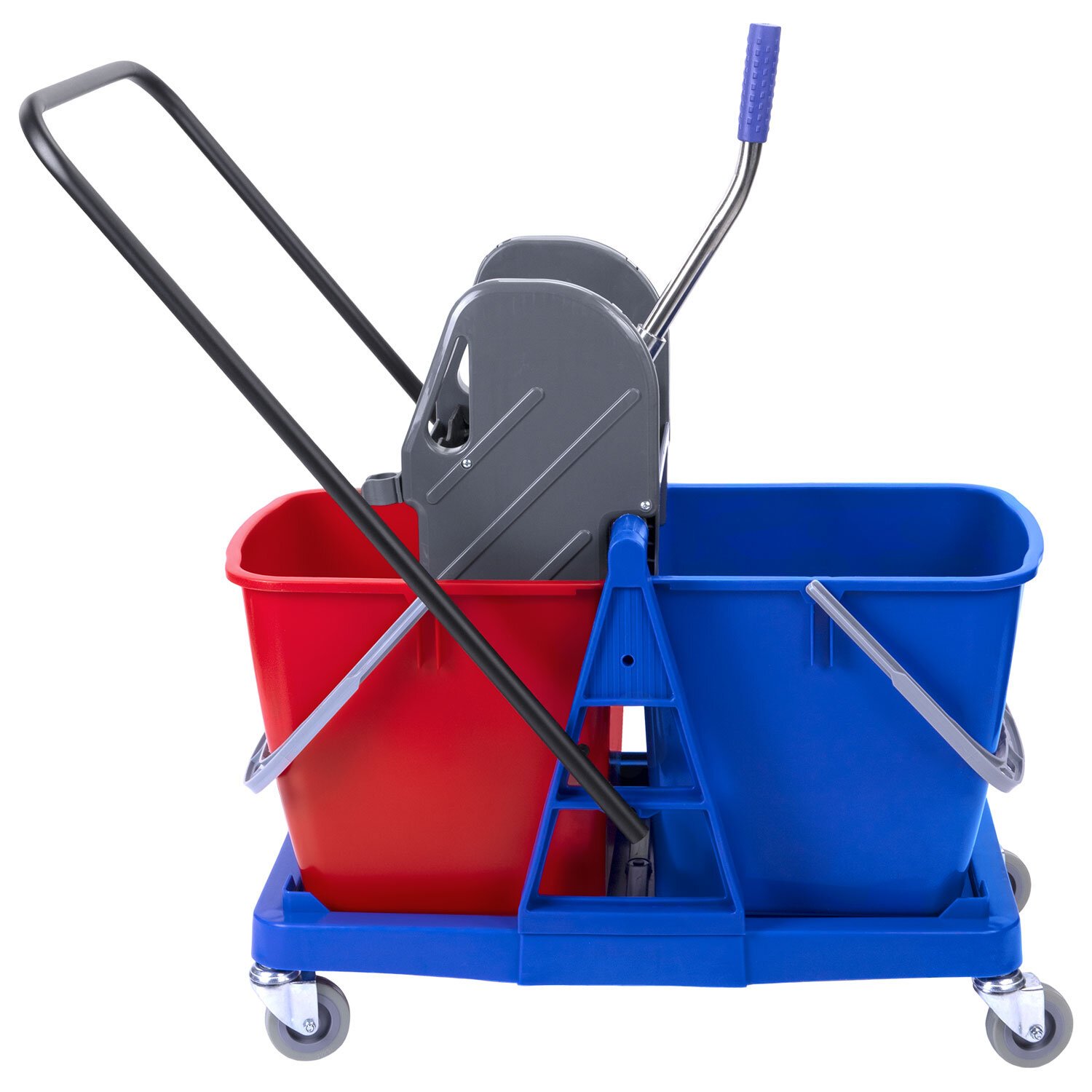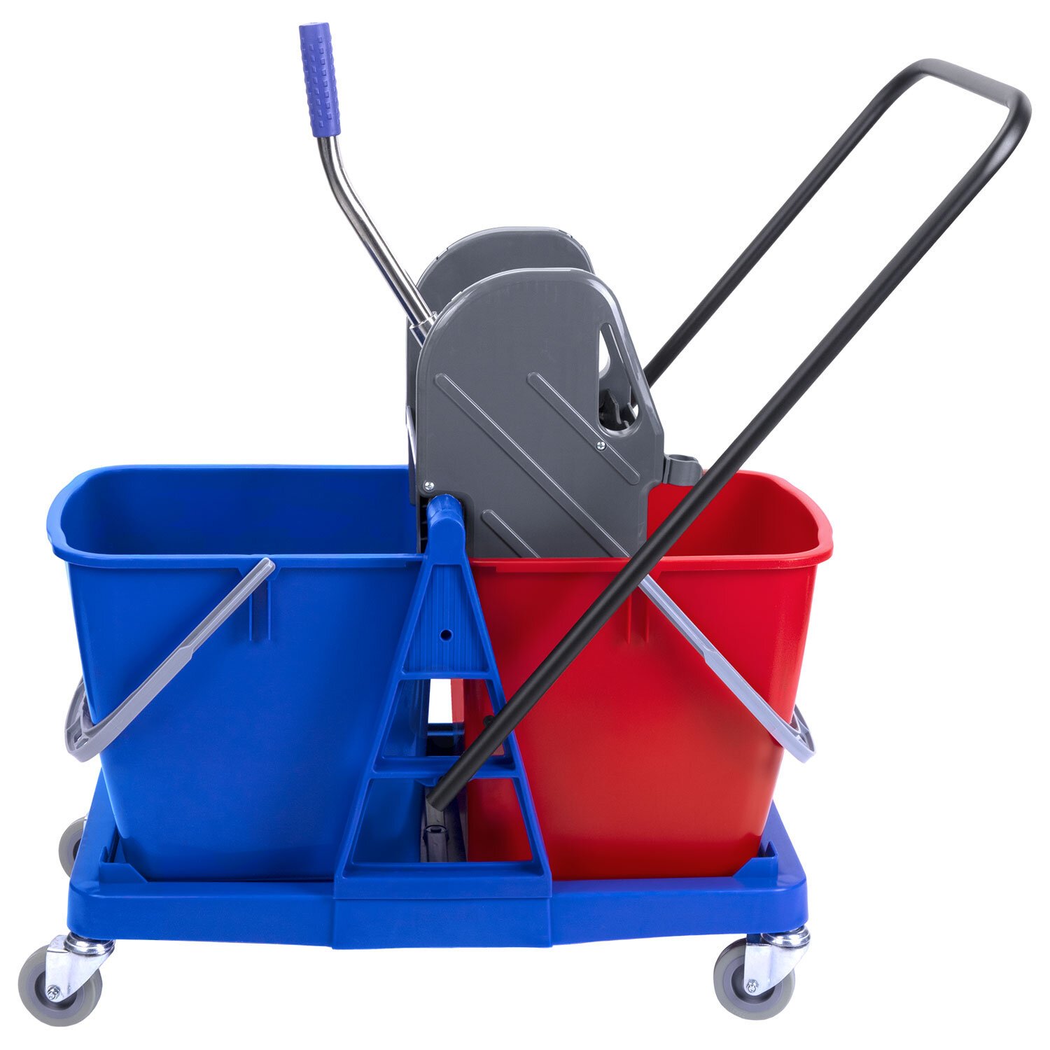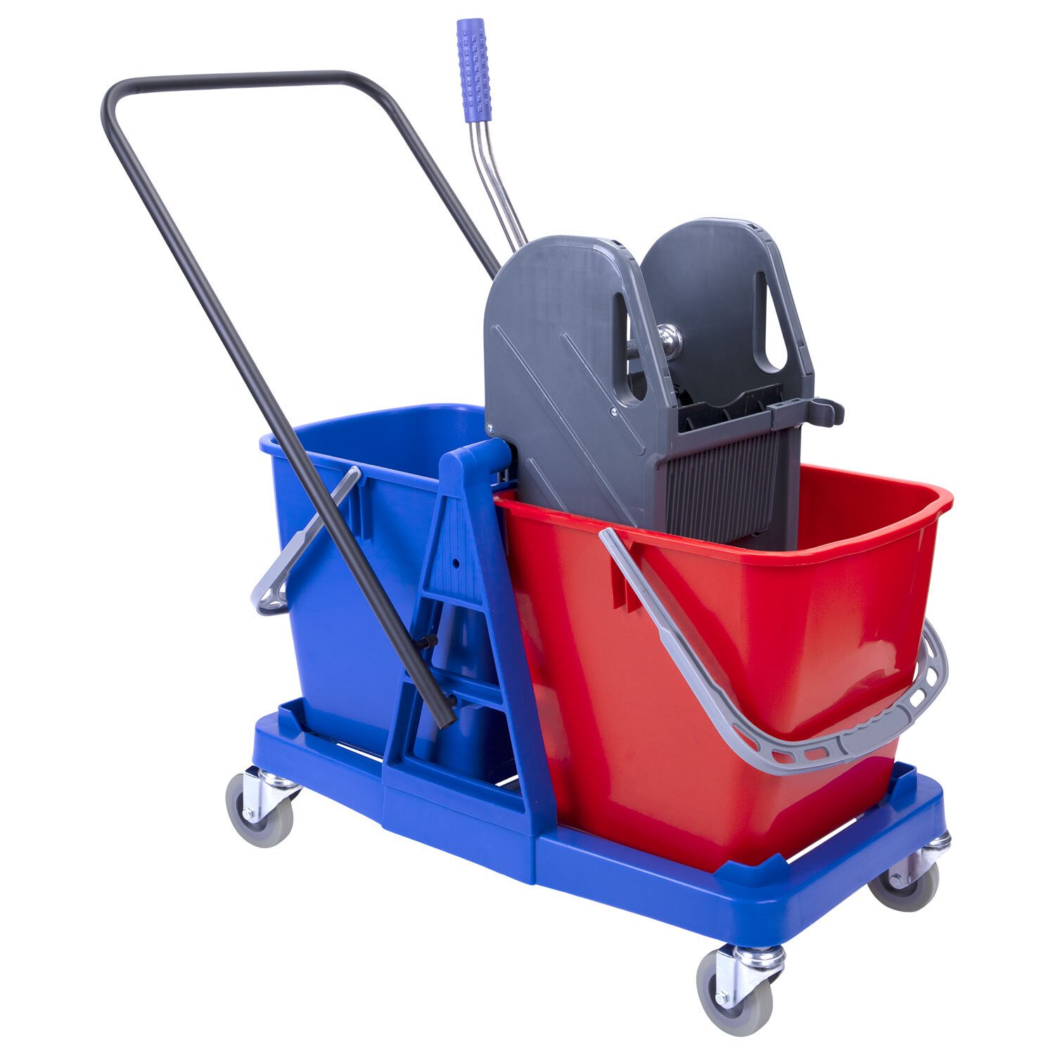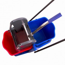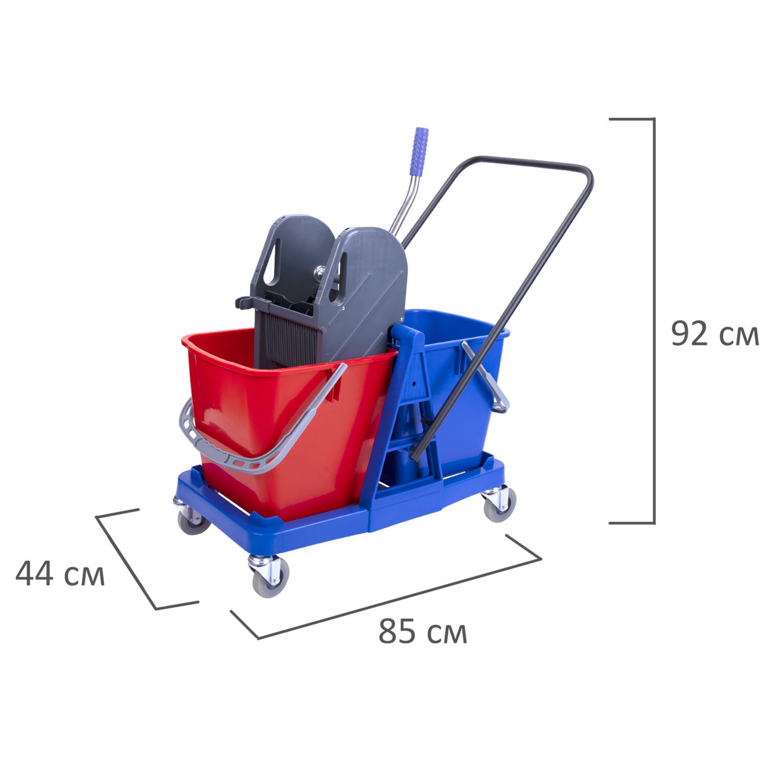 Представляет собой пластиковый каркас с установленными на него механическим отжимом для петельных тряпок и МОПов и 2 съемными ведрами по 23 л (рекомендованный объем каждого ведра - 20 л). База и инвентарь изготовлена из качественного пластика. Тележка выполнена в трехцветном исполнении: красный, синий и серый. Колеса позволяют перемещаться в произвольном направлении. Габариты - 92х44х85 см. Вес - 8 кг. Комплектация: отжим, 2 лотка, транспортная ручка, каркас.