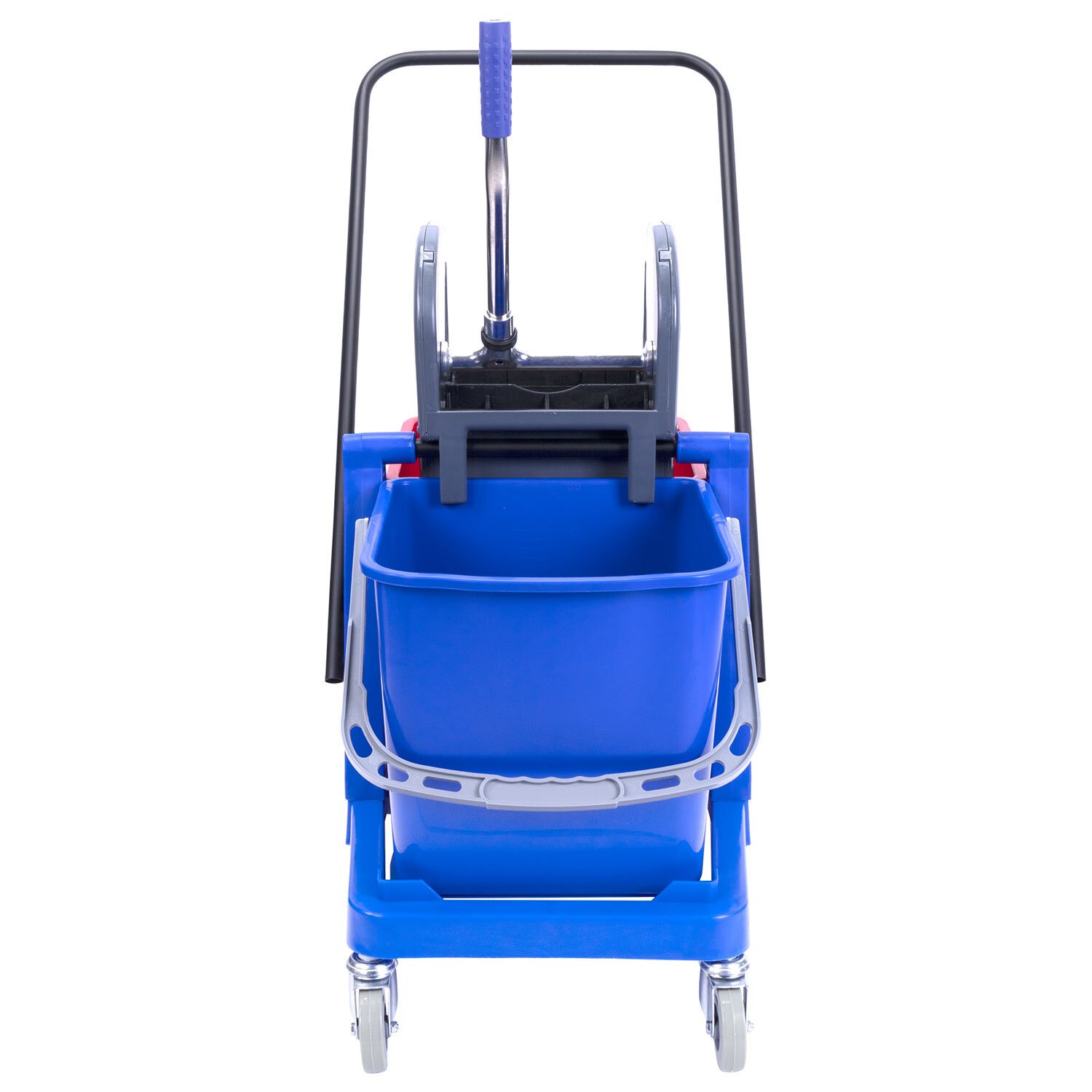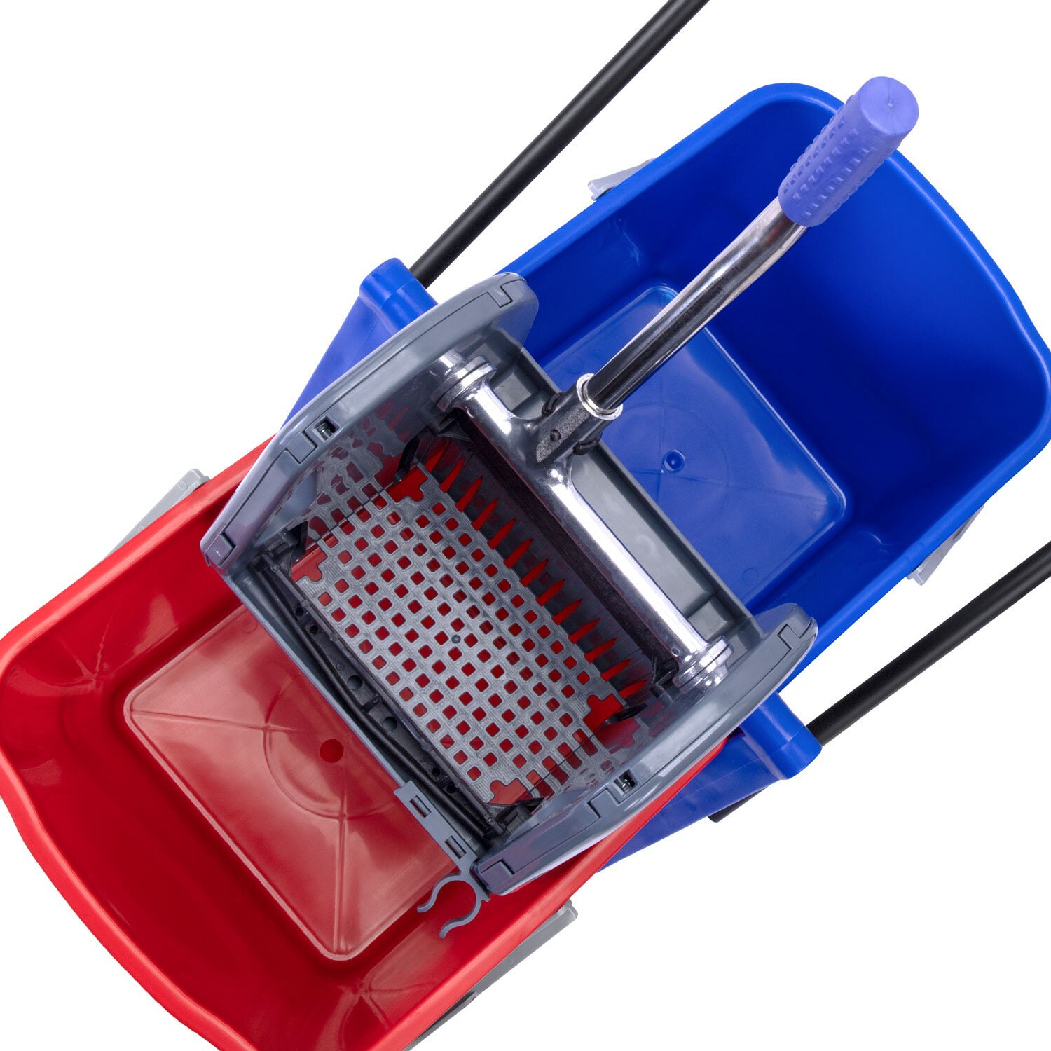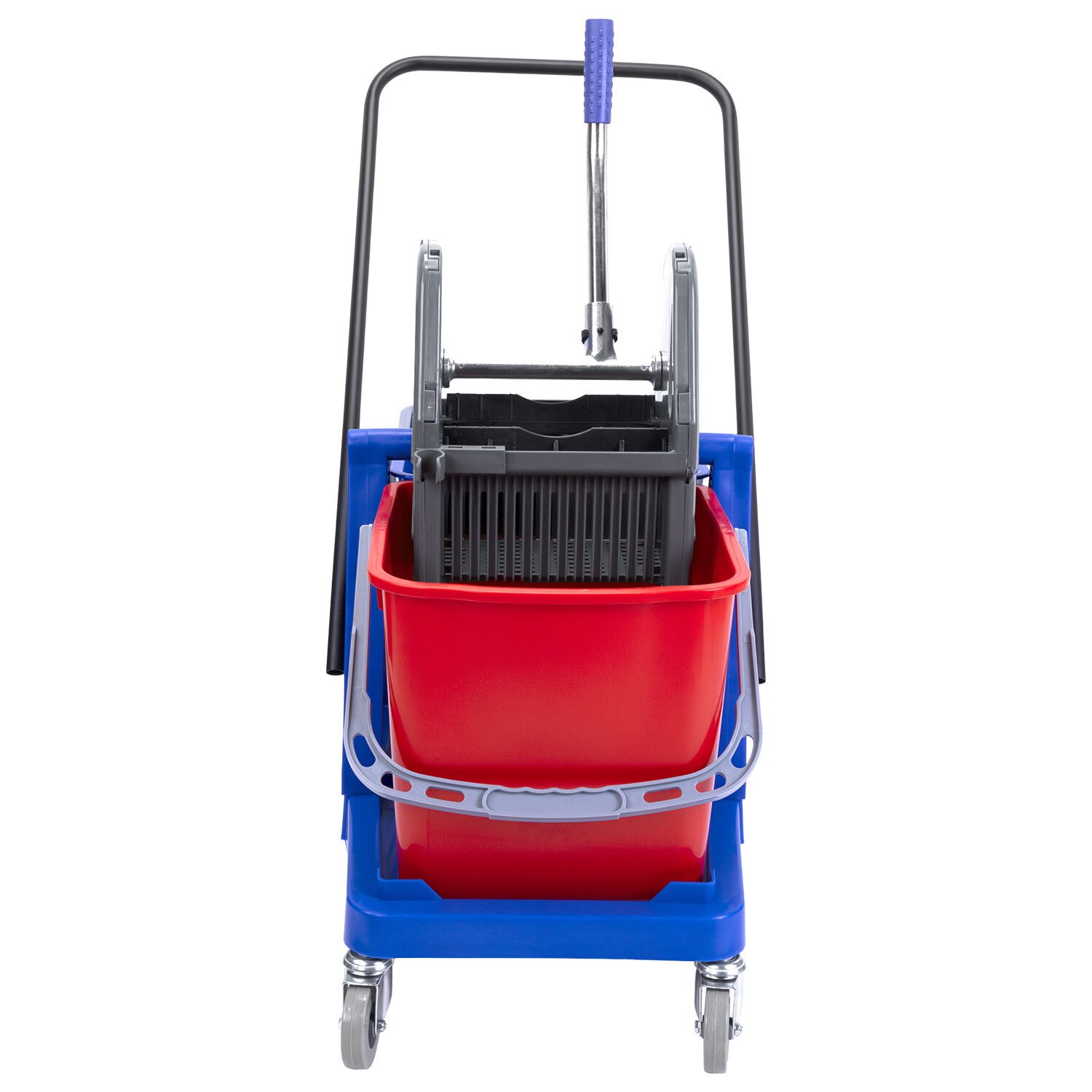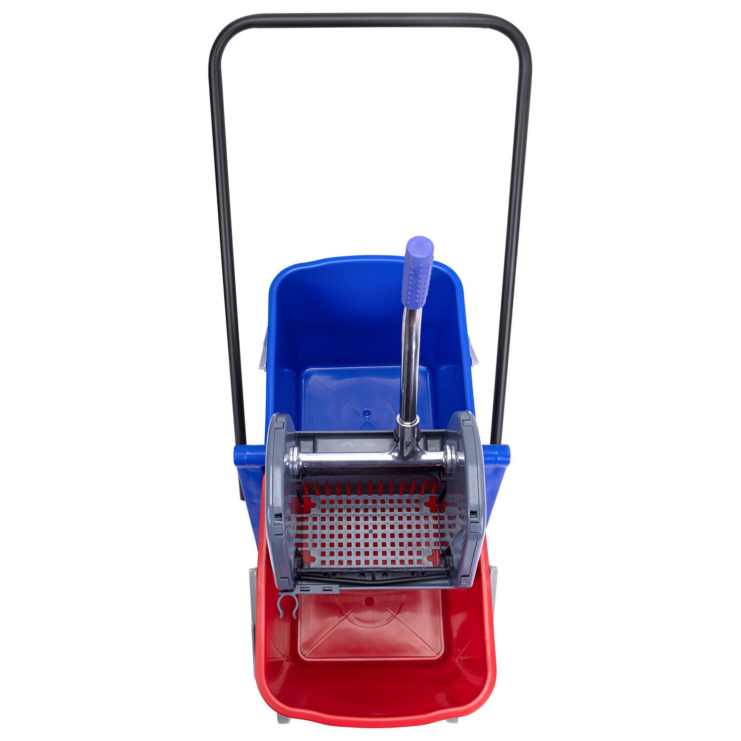Представляет собой пластиковый каркас с установленными на него механическим отжимом для петельных тряпок и МОПов и 2 съемными ведрами по 23 л (рекомендованный объем каждого ведра - 20 л). База и инвентарь изготовлена из качественного пластика. Тележка выполнена в трехцветном исполнении: красный, синий и серый. Колеса позволяют перемещаться в произвольном направлении. Габариты - 92х44х85 см. Вес - 8 кг. Комплектация: отжим, 2 лотка, транспортная ручка, каркас.