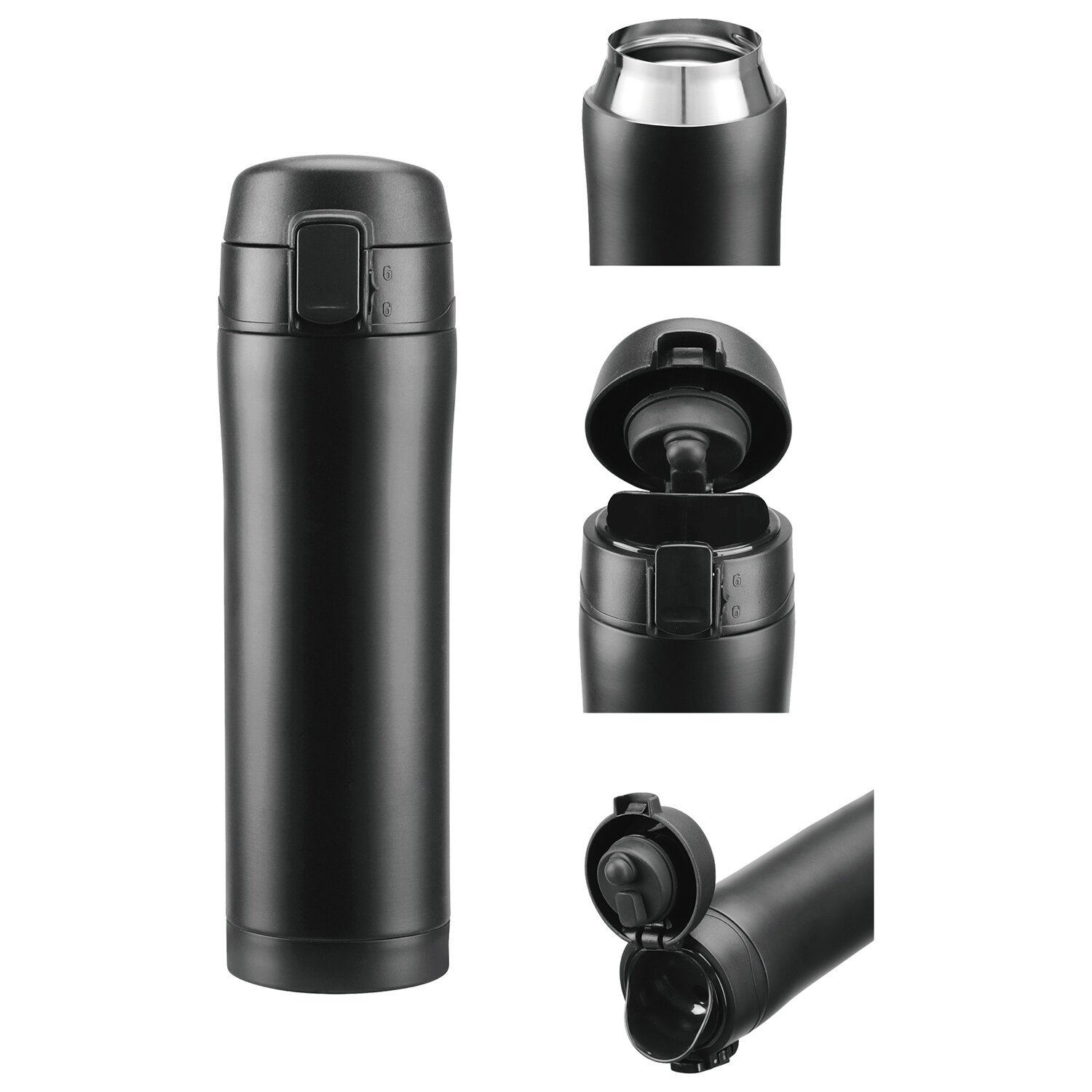 Термокружка обладает оптимальной формой для фиксации в держателе автомобиля, что позволяет использовать ее во время поездок. Термокружка снабжена откидывающейся крышкой с кнопкой, позволяющей с легкостью использовать ее одной рукой. Также, для защиты от непроизвольного нажатия кнопки, кружка имеет специальный защитный замок-предохранитель.
