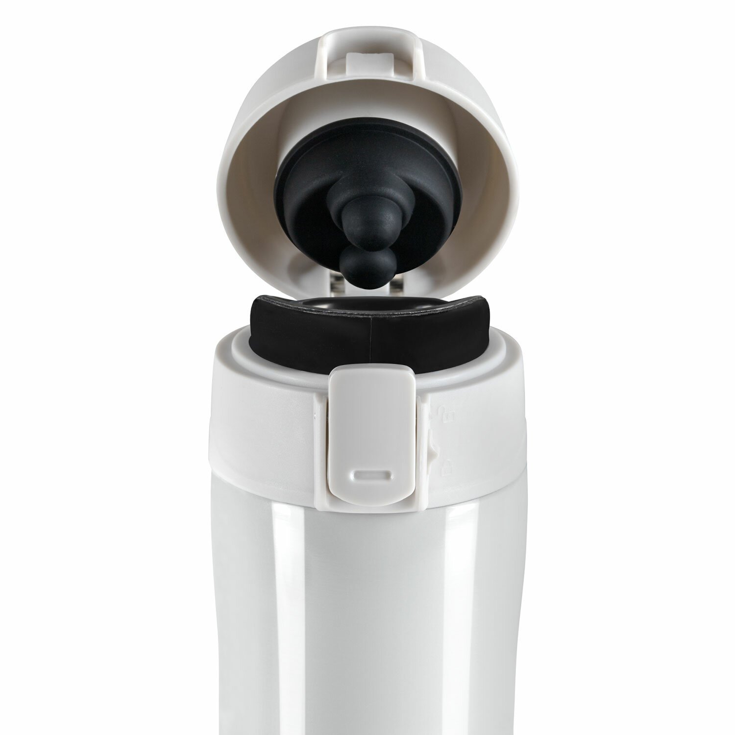 Термокружка обладает оптимальной формой для фиксации в держателе автомобиля, что позволяет использовать ее во время поездок. Термокружка снабжена откидывающейся крышкой с кнопкой, позволяющей с легкостью использовать ее одной рукой. Также, для защиты от непроизвольного нажатия кнопки, кружка имеет специальный защитный замок-предохранитель.