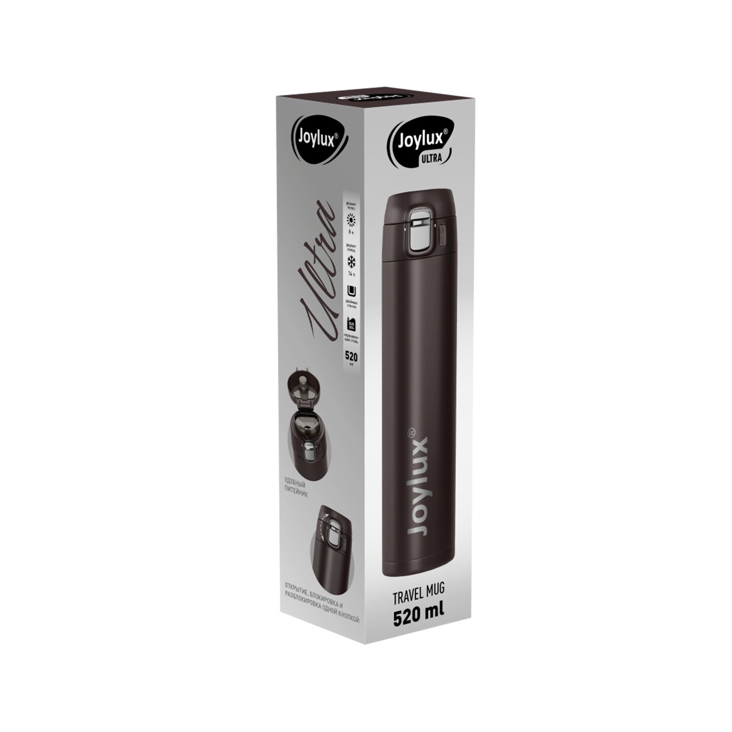 Эргономичная форма и оптимальный вес термокружки JOYLUX ULTRA BROWN делают её идеальной для ежедневного использования: она легко помещается в сумку или автомобильный подстаканник, всегда оставаясь под рукой. Герметичная система исключает случайные проливания, а эргономичный питейник обеспечивает комфортное питьё без необходимости снимать крышку. Корпус термокружки снабжен многофункциональной кнопкой, которая позволяет одним движением открывать, блокировать и разблокировать крышку, делая использование максимально удобным.